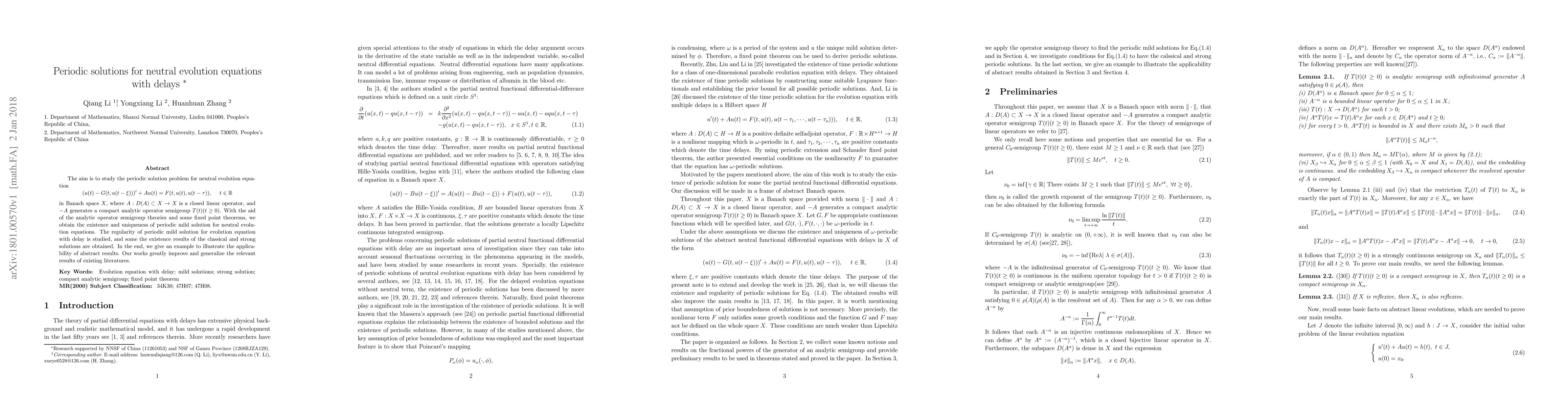 This paper studies periodic solutions for neutral evolution equations with delays, using analytic operator semigroup theories and fixed point theorems to prove existence and uniqueness of periodic mild solutions, as well as regularity and strong solution existence results.