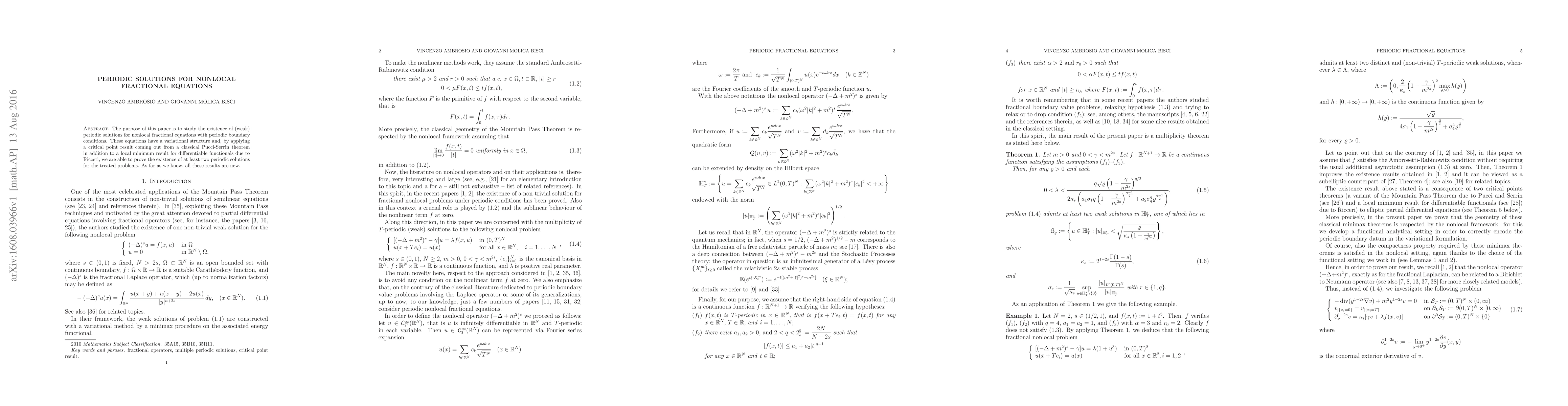 The purpose of this paper is to study the existence of (weak) periodic solutions for nonlocal fractional equations with periodic boundary conditions. These equations have a variational structure and, by applying a critical point result coming out from a classical Pucci-Serrin theorem in addition to a local minimum result for differentiable functionals due to Ricceri, we are able to prove the existence of at least two periodic solutions for the treated problems. As far as we know, all these results are new.