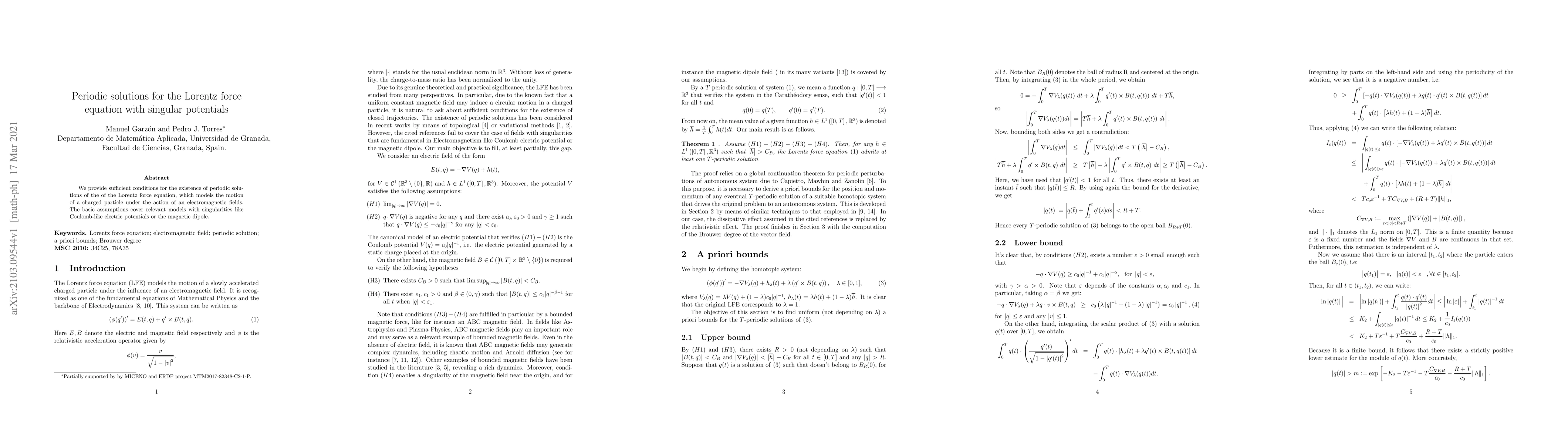 This paper establishes conditions for periodic solutions in the Lorentz force equation, which models charged particle motion under electromagnetic fields. It focuses on singular potentials like Coulomb-like electric potentials or magnetic dipoles.