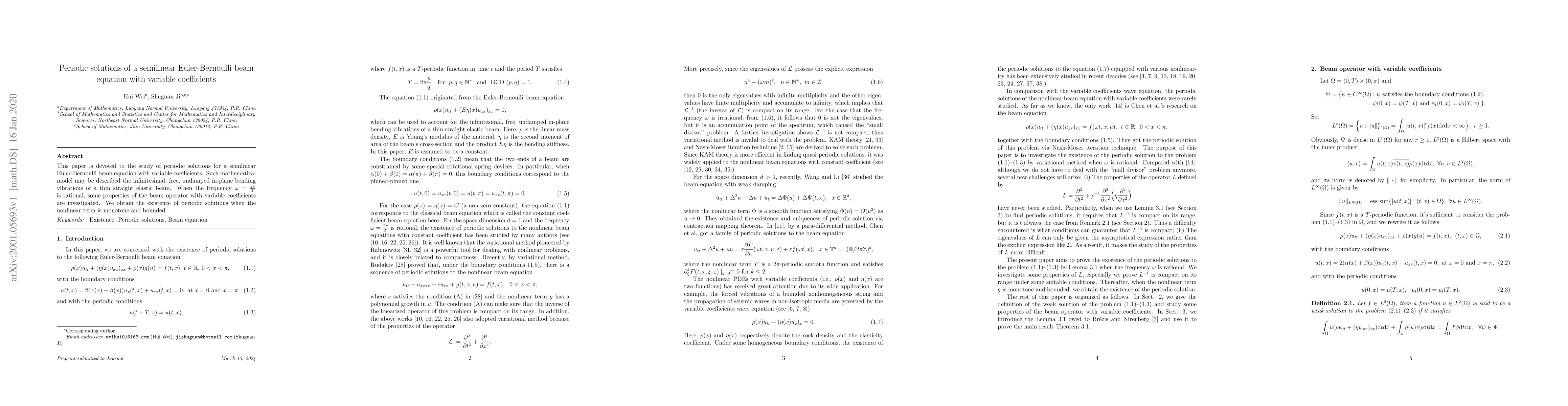 This paper investigates periodic solutions for a semilinear Euler-Bernoulli beam equation with variable coefficients, focusing on the case when the frequency is rational. It establishes the existence of periodic solutions under the condition that the nonlinear term is monotone and bounded.
