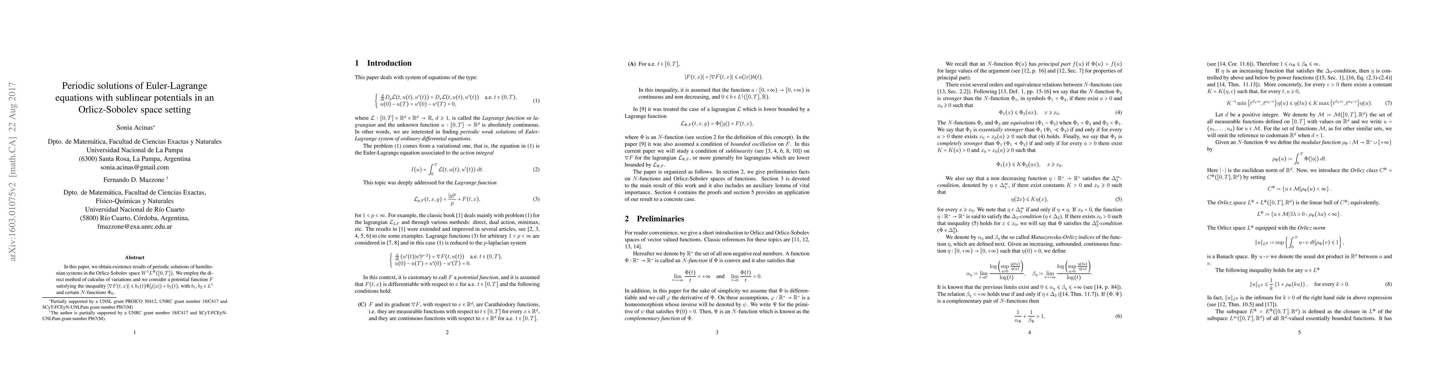 In this paper, we obtain existence results of periodic solutions of hamiltonian systems in the Orlicz-Sobolev space $W^1L^{\Phi}([0,T])$. We employ the direct method of calculus of variations and we consider a potential function $F$ satisfying the inequality $|\nabla F(t,x)|\leq b_1(t) \Phi_0'(|x|)+b_2(t)$, with $b_1, b_2\in L^1$ and certain $N$-functions $\Phi_0$.