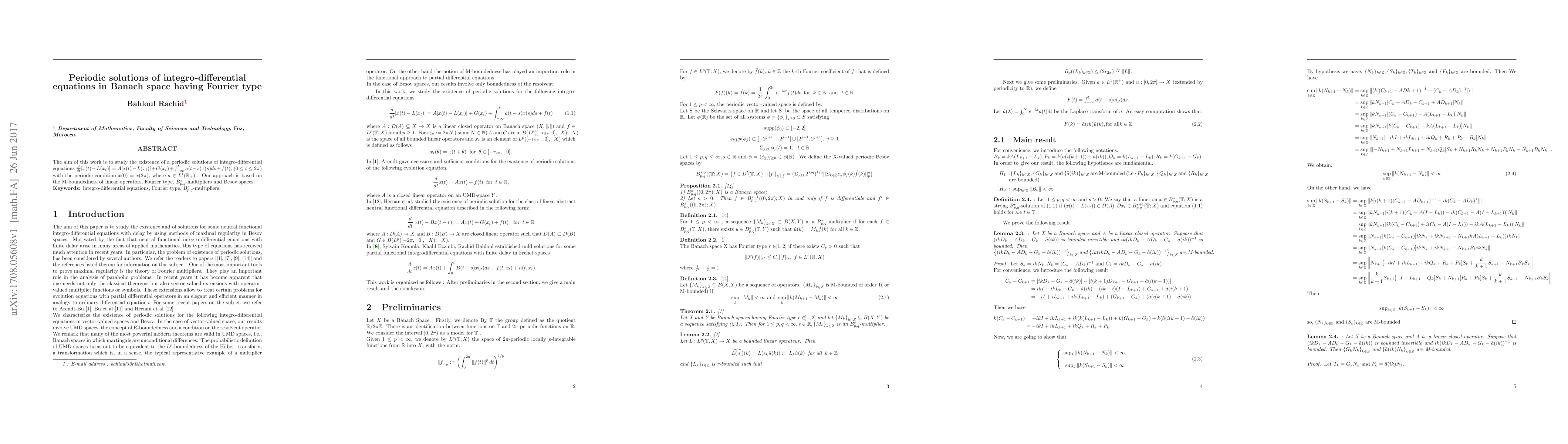 This paper investigates the existence of periodic solutions for a specific type of integro-differential equation in Banach space, utilizing Fourier type, B s p,q-multipliers and Besov spaces to establish conditions for their existence.