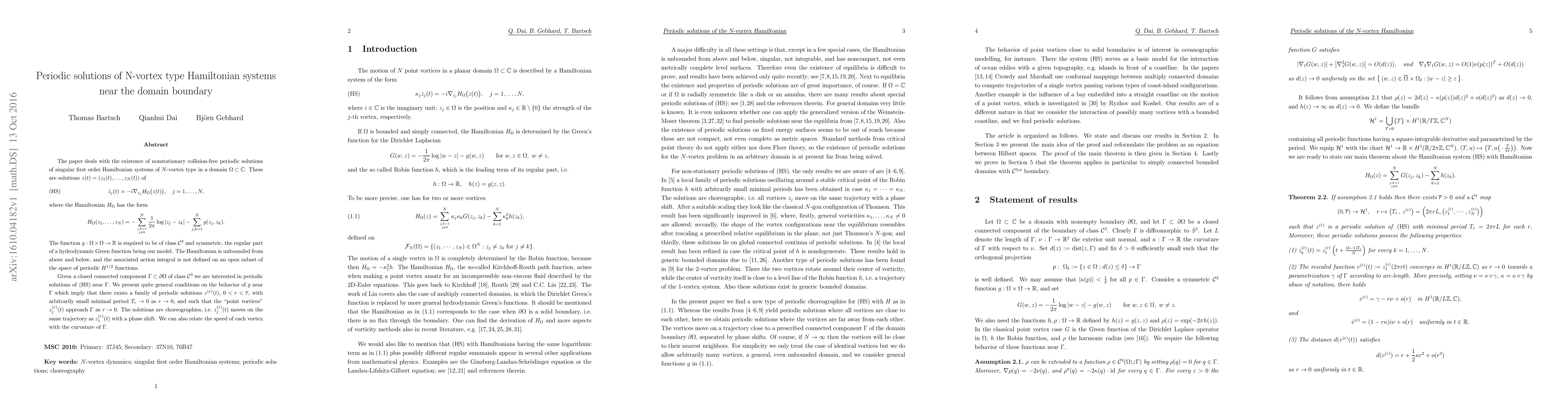 The paper investigates the existence of nonstationary, collision-free periodic solutions for $N$-vortex Hamiltonian systems near the boundary of a complex domain $\Omega$. It establishes conditions on the function $g$ near $\Gamma$, a $C^3$ closed boundary component, that ensure the existence of a family of periodic solutions approaching $\Gamma$ as the period tends to zero.