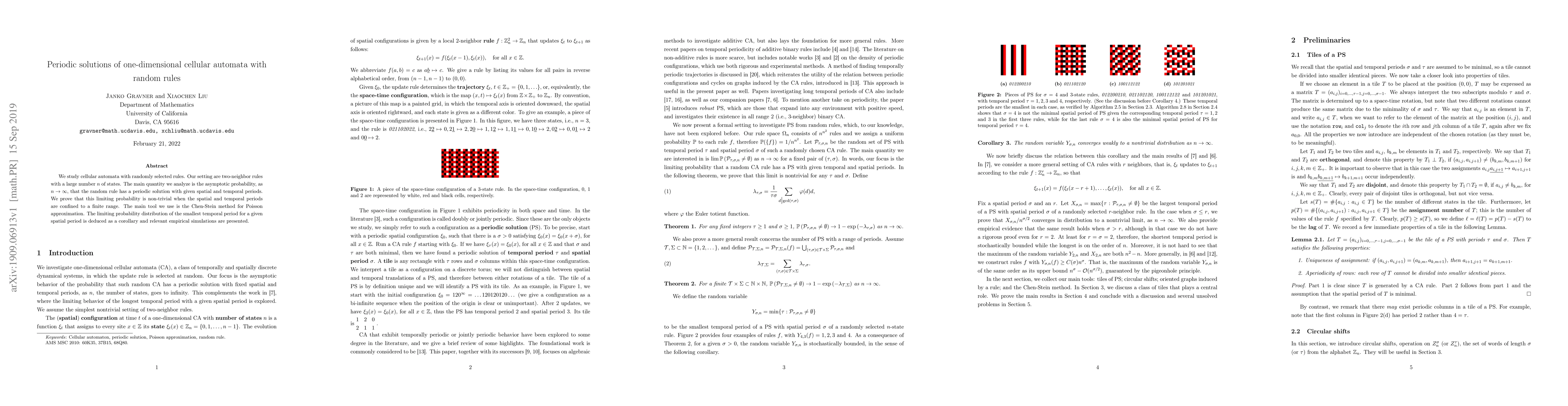 We study cellular automata with randomly selected rules. Our setting are two-neighbor rules with a large number $n$ of states. The main quantity we analyze is the asymptotic probability, as $n \to \infty$, that the random rule has a periodic solution with given spatial and temporal periods. We prove that this limiting probability is non-trivial when the spatial and temporal periods are confined to a finite range. The main tool we use is the Chen-Stein method for Poisson approximation. The limiting probability distribution of the smallest temporal period for a given spatial period is deduced as a corollary and relevant empirical simulations are presented.