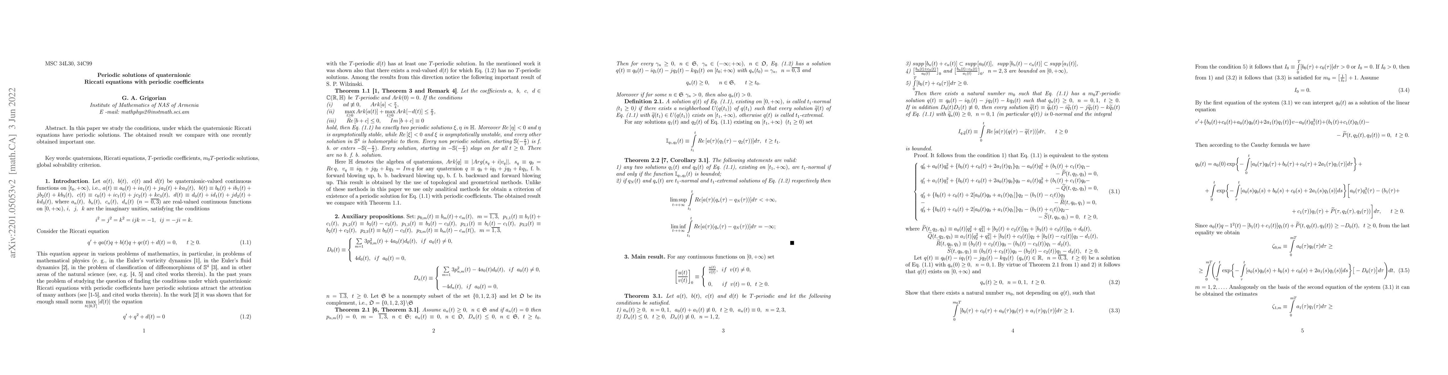 Summary: This paper investigates the conditions for the existence of periodic solutions to quaternionic Riccati equations with periodic coefficients. The findings are compared with a recently established significant result in the field.