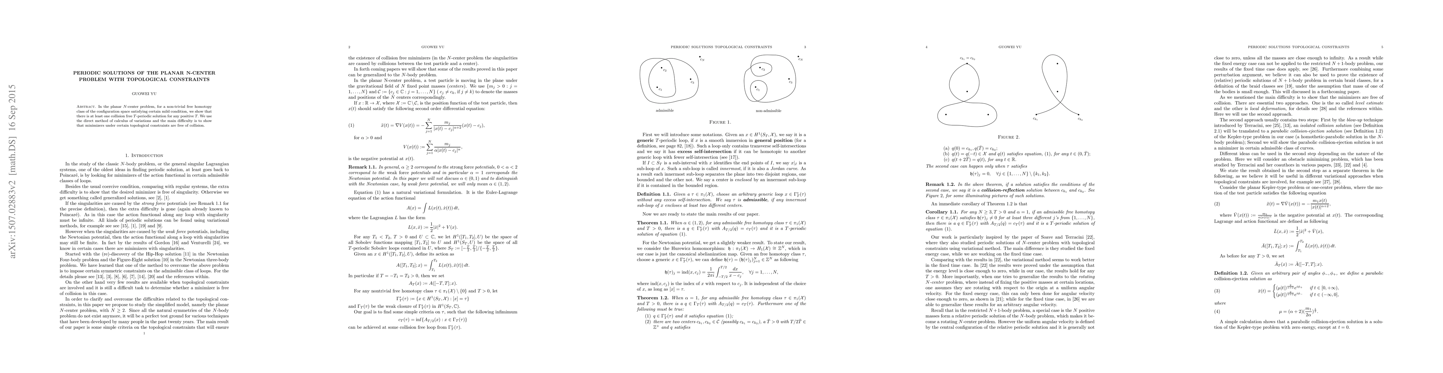 Summary: The paper demonstrates the existence of at least one collision-free $T$-periodic solution for the planar $N$-center problem within a specified non-trivial free homotopy class, using the direct method of calculus of variations. The main challenge is proving that minimizers under topological constraints avoid collisions.