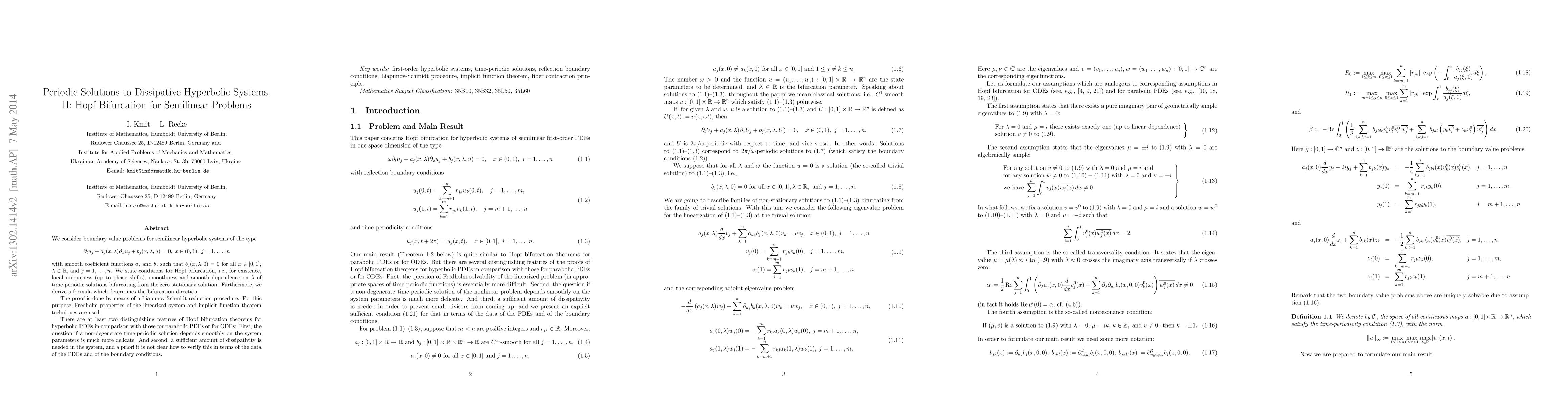 This paper investigates Hopf bifurcation in semilinear hyperbolic systems, focusing on the conditions for the existence of periodic solutions emerging from the zero stationary solution. It employs a Liapunov-Schmidt reduction and Fredholm properties to derive a formula for bifurcation direction, highlighting the complexities and requirements of dissipativity in hyperbolic PDEs compared to parabolic PDEs or ODEs.