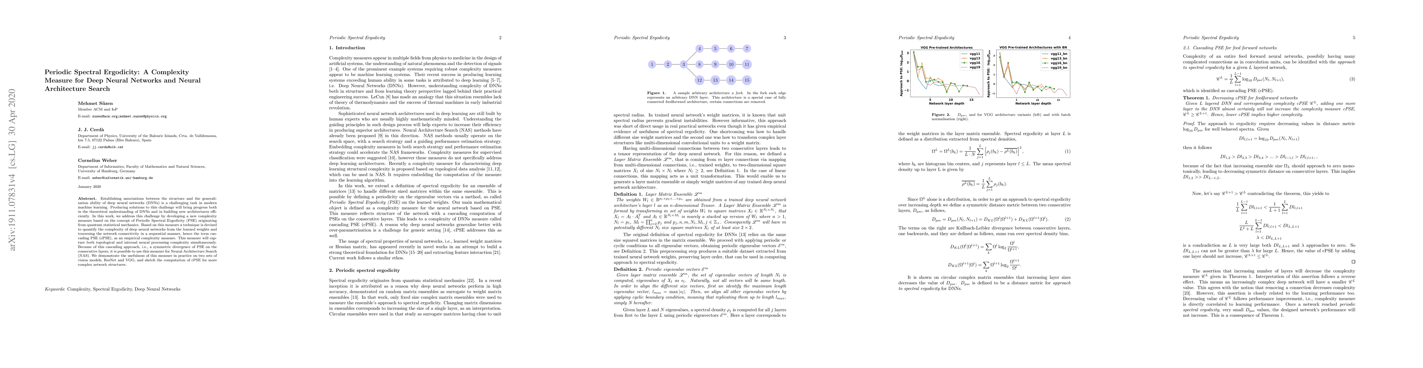 Establishing associations between the structure and the generalisation ability of deep neural networks (DNNs) is a challenging task in modern machine learning. Producing solutions to this challenge will bring progress both in the theoretical understanding of DNNs and in building new architectures efficiently. In this work, we address this challenge by developing a new complexity measure based on the concept of {Periodic Spectral Ergodicity} (PSE) originating from quantum statistical mechanics. Based on this measure a technique is devised to quantify the complexity of deep neural networks from the learned weights and traversing the network connectivity in a sequential manner, hence the term cascading PSE (cPSE), as an empirical complexity measure. This measure will capture both topological and internal neural processing complexity simultaneously. Because of this cascading approach, i.e., a symmetric divergence of PSE on the consecutive layers, it is possible to use this measure for Neural Architecture Search (NAS). We demonstrate the usefulness of this measure in practice on two sets of vision models, ResNet and VGG, and sketch the computation of cPSE for more complex network structures.