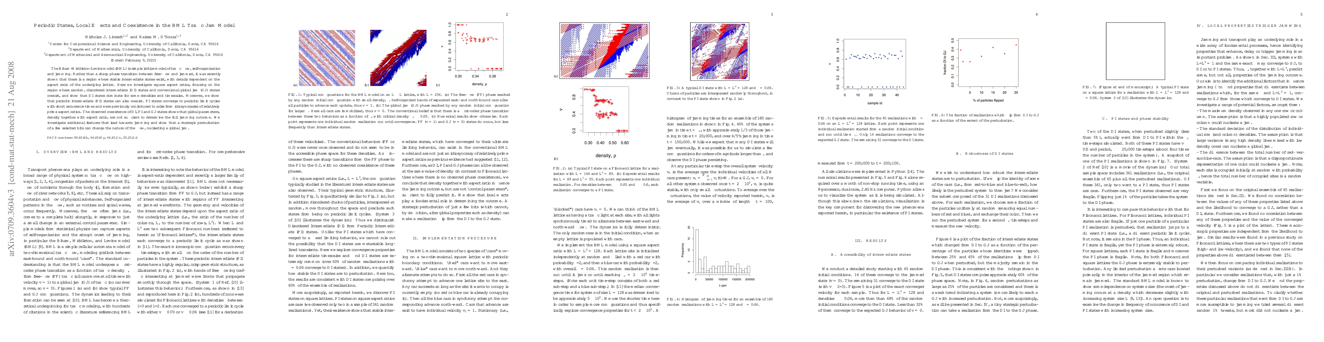 Researchers studied how traffic flows in a lattice model called BML, finding that intermediate states can coexist with either stable jams or periodic cycles, depending on density and aspect ratio. A strategic perturbation of individual bits can trigger a global jam.