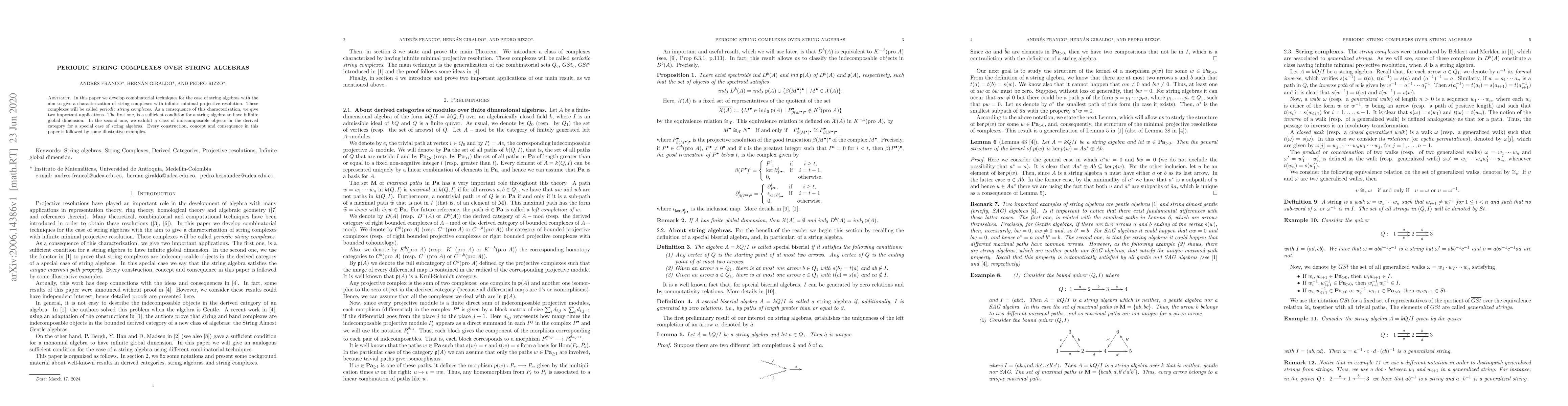 In this paper we develop combinatorial techniques for the case of string algebras with the aim to give a characterization of string complexes with infinite minimal projective resolution. These complexes will be called \textit{periodic string complexes}. As a consequence of this characterization, we give two important applications. The first one, is a sufficient condition for a string algebra to have infinite global dimension. In the second one, we exhibit a class of indecomposable objects in the derived category for a special case of string algebras. Every construction, concept and consequence in this paper is followed by some illustrative examples.