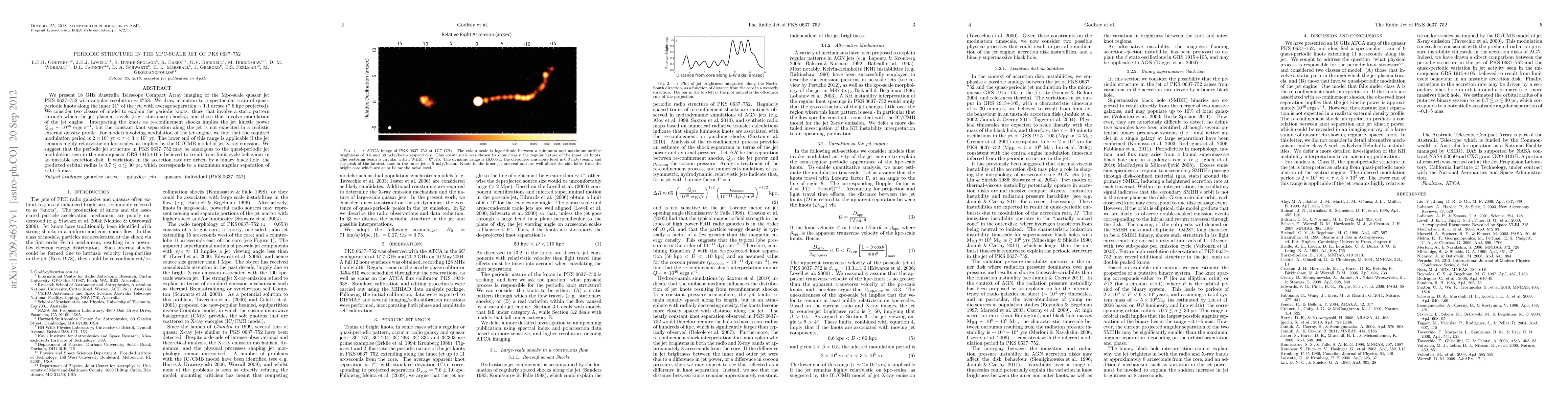 We present 18 GHz Australia Telescope Compact Array imaging of the Mpc-scale quasar jet PKS 0637-752 with angular resolution ~0.58 arcseconds. We draw attention to a spectacular train of quasi-periodic knots along the inner 11 arcseconds of the jet, with average separation ~1.1 arcsec (7.6 kpc projected). We consider two classes of model to explain the periodic knots: those that involve a static pattern through which the jet plasma travels (e.g. stationary shocks); and those that involve modulation of the jet engine. Interpreting the knots as re-confinement shocks implies the jet kinetic power Q ~ 10^{46} erg/s, but the constant knot separation along the jet is not expected in a realistic external density profile. For models involving modulation of the jet engine, we find that the required modulation period is 2 x 10^3 yr < \tau < 3 x 10^5 yr. The lower end of this range is applicable if the jet remains highly relativistic on kpc-scales, as implied by the IC/CMB model of jet X-ray emission. We suggest that the quasi-periodic jet structure in PKS 0637-752 may be analogous to the quasi-periodic jet modulation seen in the microquasar GRS 1915+105, believed to result from limit cycle behaviour in an unstable accretion disk. If variations in the accretion rate are driven by a binary black hole, the predicted orbital radius is 0.7 < a < 30 pc, which corresponds to a maximum angular separation of ~0.1 - 5 mas.