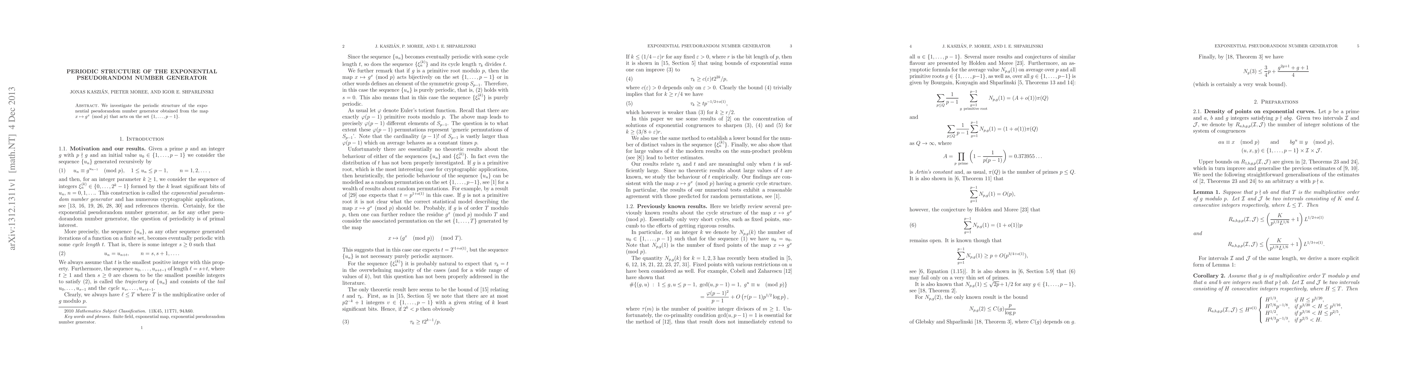 Summary: This paper examines the periodic behavior of an exponential pseudorandom number generator based on the modular exponentiation map $x\mapsto g^x\pmod p$, focusing on its structure within the set $\{1, \ldots, p-1\}$. The study aims to understand the generator's periodicity and its implications for pseudorandomness.