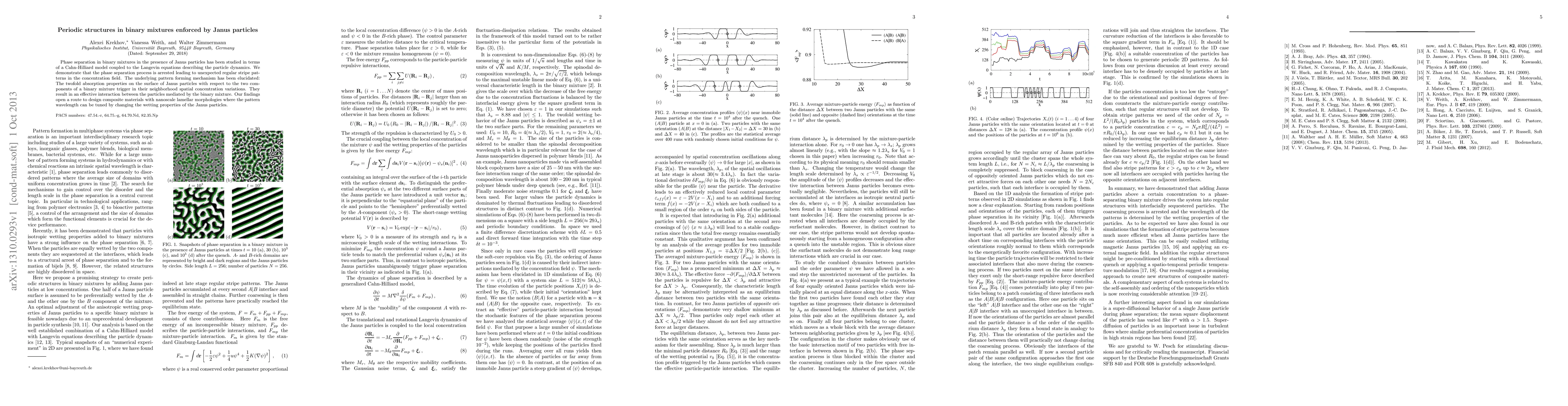 This paper investigates phase separation in binary mixtures influenced by Janus particles, revealing the formation of regular stripe patterns due to the particles' unique absorption properties. The study elucidates that these patterns arise from the effective interaction mediated by the binary mixture, offering a method to design composite materials with tunable nanoscale lamellar structures.