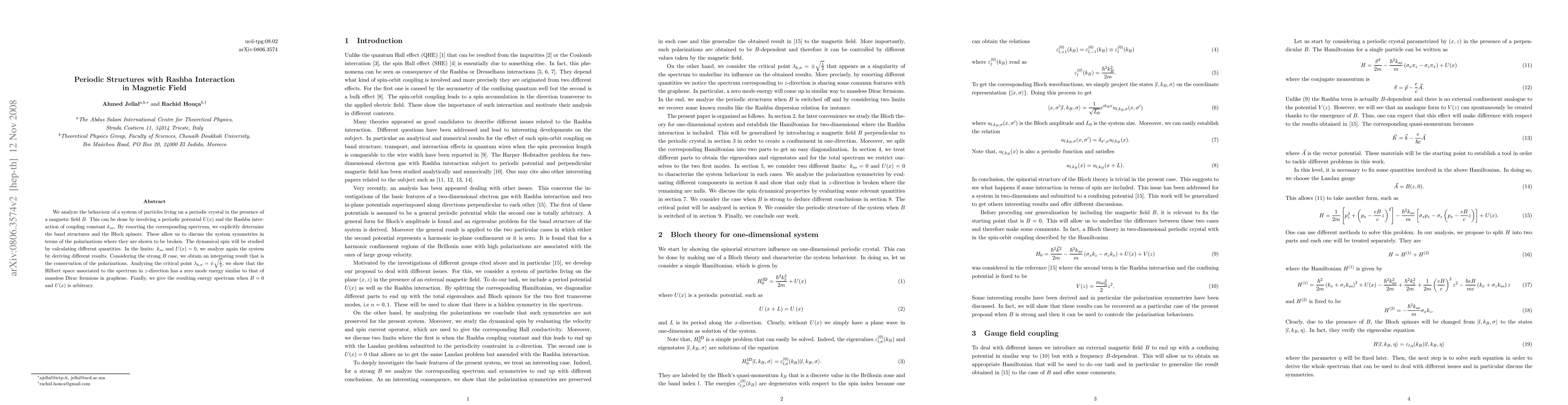We analyze the behaviour of a system of particles living on a periodic crystal in the presence of a magnetic field B. This can be done by involving a periodic potential U(x) and the Rashba interaction of coupling constant k_{so}. By resorting the corresponding spectrum, we explicitly determine the band structures and the Bloch spinors. These allow us to discuss the system symmetries in terms of the polarizations where they are shown to be broken. The dynamical spin will be studied by calculating different quantities. In the limits: k_{so} and U(x)=0, we analyze again the system by deriving different results. Considering the strong $B$ case, we obtain an interesting result that is the conservation of the polarizations. Analyzing the critical point \lambda_{k,\sigma}=\pm\sq{1\over 2}, we show that the Hilbert space associated to the spectrum in z-direction has a zero mode energy similar to that of massless Dirac fermions in graphene. Finally, we give the resulting energy spectrum when B=0 and U(x) is arbitrary.