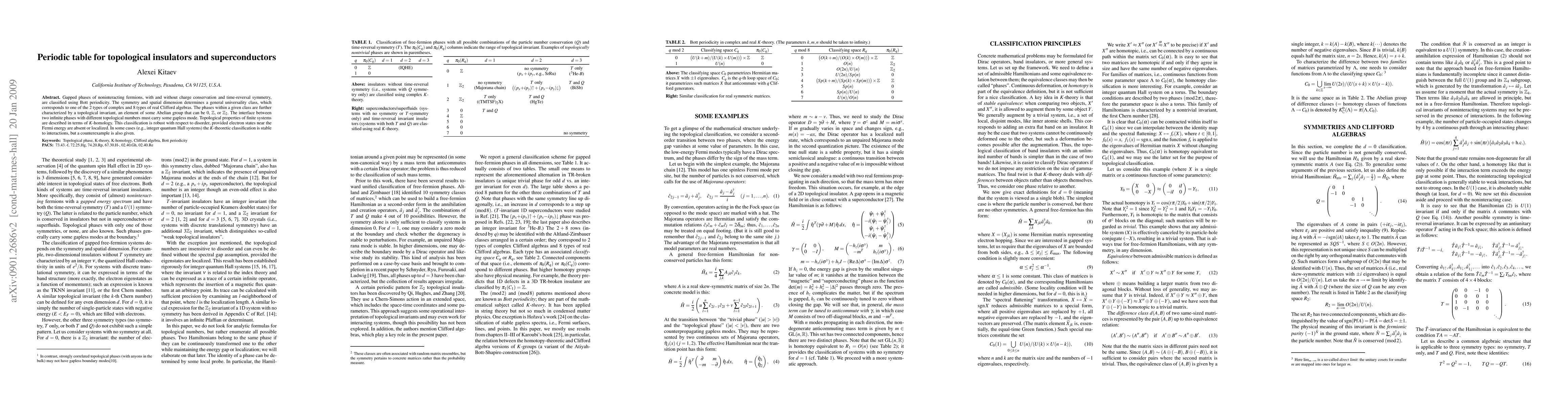 Gapped phases of noninteracting fermions, with and without charge conservation and time-reversal symmetry, are classified using Bott periodicity. The symmetry and spatial dimension determines a general universality class, which corresponds to one of the 2 types of complex and 8 types of real Clifford algebras. The phases within a given class are further characterized by a topological invariant, an element of some Abelian group that can be 0, Z, or Z_2. The interface between two infinite phases with different topological numbers must carry some gapless mode. Topological properties of finite systems are described in terms of K-homology. This classification is robust with respect to disorder, provided electron states near the Fermi energy are absent or localized. In some cases (e.g., integer quantum Hall systems) the K-theoretic classification is stable to interactions, but a counterexample is also given.