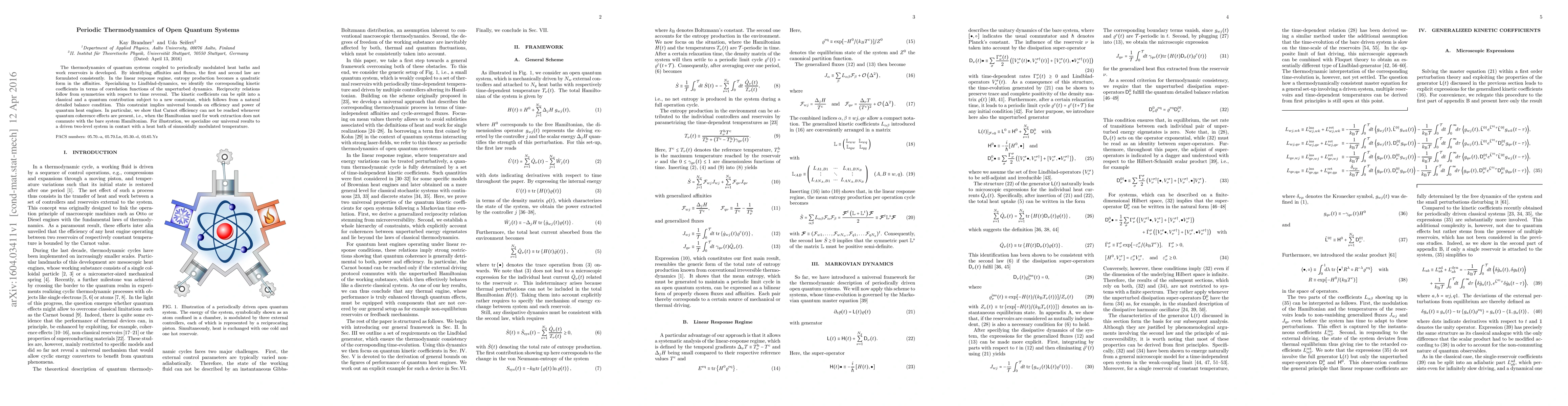 The thermodynamics of quantum systems coupled to periodically modulated heat baths and work reservoirs is developed. By identifying affinities and fluxes, the first and second law are formulated consistently. In the linear response regime, entropy production becomes a quadratic form in the affinities. Specializing to Lindblad-dynamics, we identify the corresponding kinetic coefficients in terms of correlation functions of the unperturbed dynamics. Reciprocity relations follow from symmetries with respect to time reversal. The kinetic coefficients can be split into a classical and a quantum contribution subject to a new constraint, which follows from a natural detailed balance condition. This constraint implies universal bounds on efficiency and power of quantum heat engines. In particular, we show that Carnot efficiency can not be reached whenever quantum coherence effects are present, i.e., when the Hamiltonian used for work extraction does not commute with the bare system Hamiltonian. For illustration, we specialize our universal results to a driven two-level system in contact with a heat bath of sinusoidally modulated temperature.