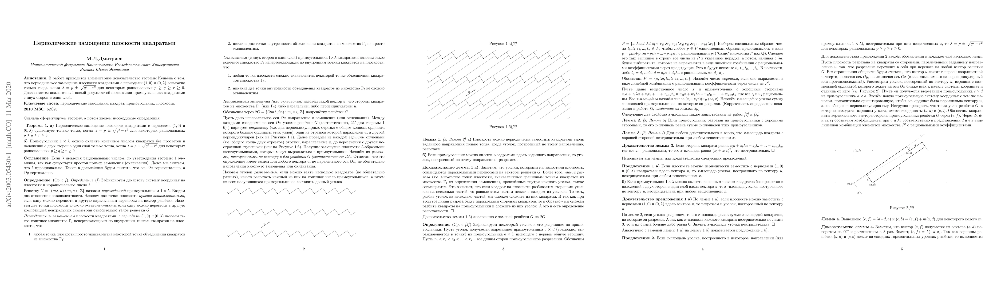The paper presents an elementary proof of Kenyon's necessary condition for periodic tiling of the plane by squares with specified periods. Additionally, it proves a new result regarding the nonoverlapping covering of both sides of a rectangle with squares.