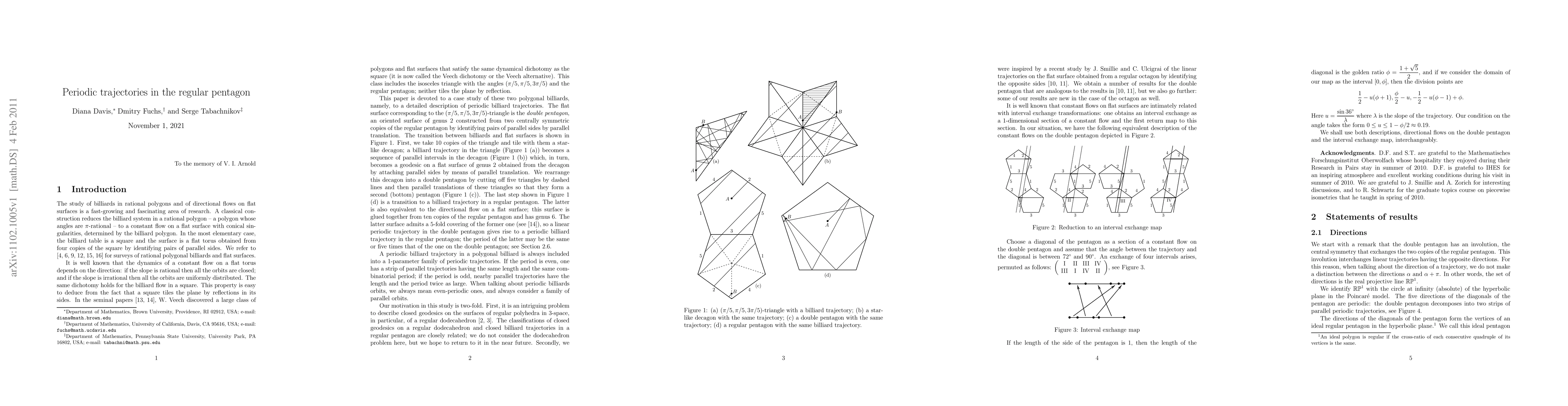 Summary: This paper investigates periodic linear trajectories within a double pentagon and periodic billiard trajectories within a regular pentagon, exploring their geometric properties and dynamics.