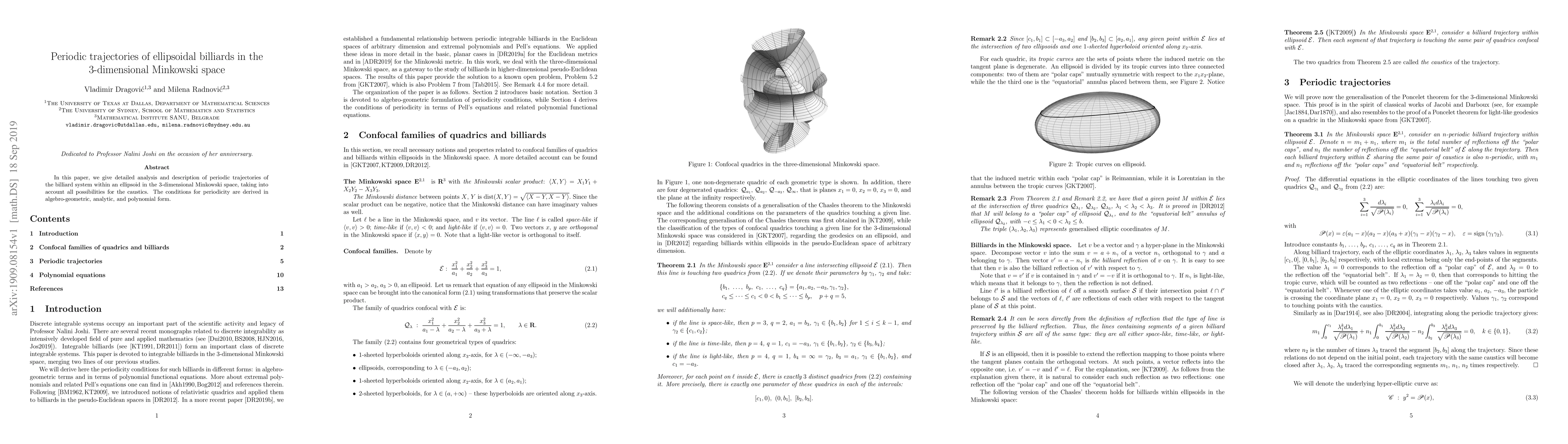 Researchers analyzed periodic trajectories of an ellipsoidal billiard system in 3D Minkowski space, deriving conditions for periodicity through algebro-geometric, analytic, and polynomial forms.