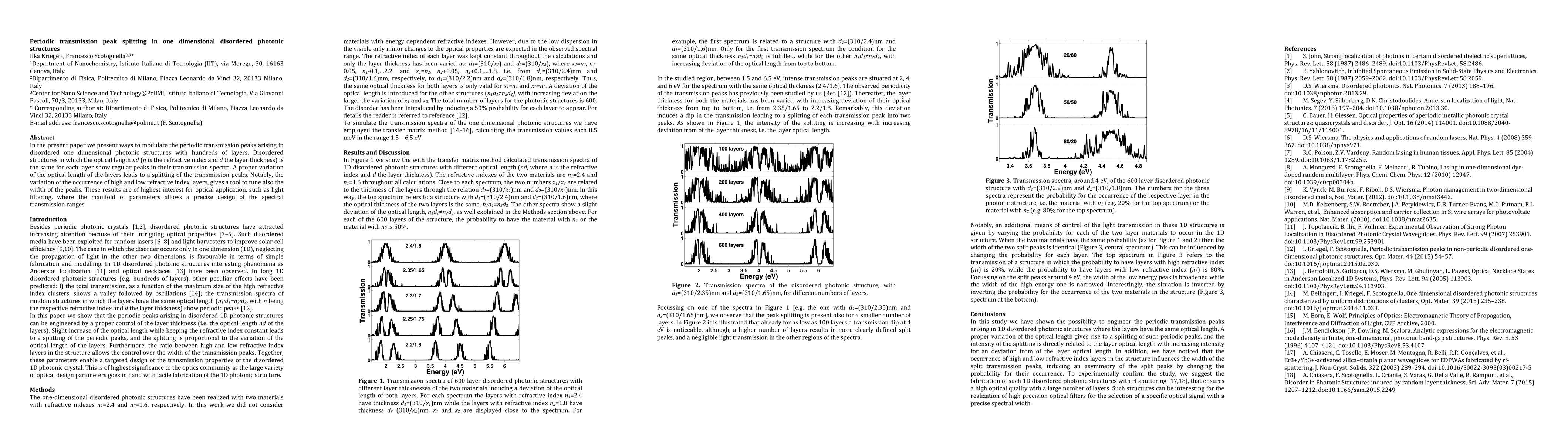 This paper explores how periodic transmission peaks in one-dimensional disordered photonic structures can be modulated by varying the optical length of each layer. The study reveals that adjusting the refractive index and layer thickness can split and tune the width of transmission peaks, which is crucial for precise optical applications like light filtering.