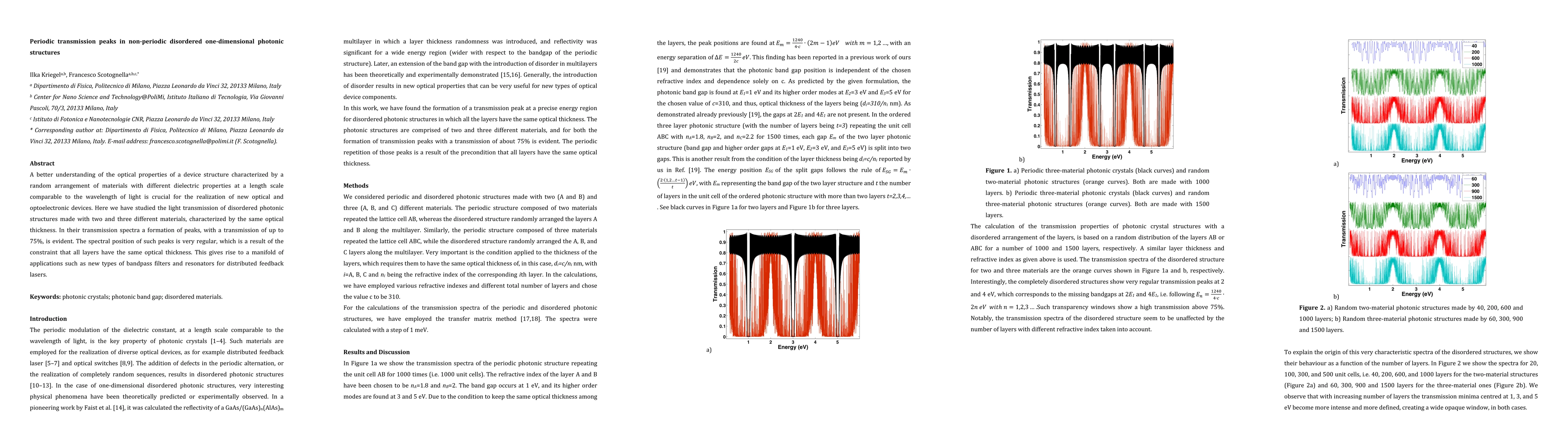 A better understanding of the optical properties of a device structure characterized by a random arrangement of materials with different dielectric properties at a length scale comparable to the wavelength of light is crucial for the realization of new optical and optoelectronic devices. Here we have studied the light transmission of disordered photonic structures made with two and three different materials, characterized by the same optical thickness. In their transmission spectra a formation of peaks, with a transmission of up to 75%, is evident. The spectral position of such peaks is very regular, which is a result of the constraint that all layers have the same optical thickness. This gives rise to a manifold of applications such as new types of bandpass filters and resonators for distributed feedback lasers.