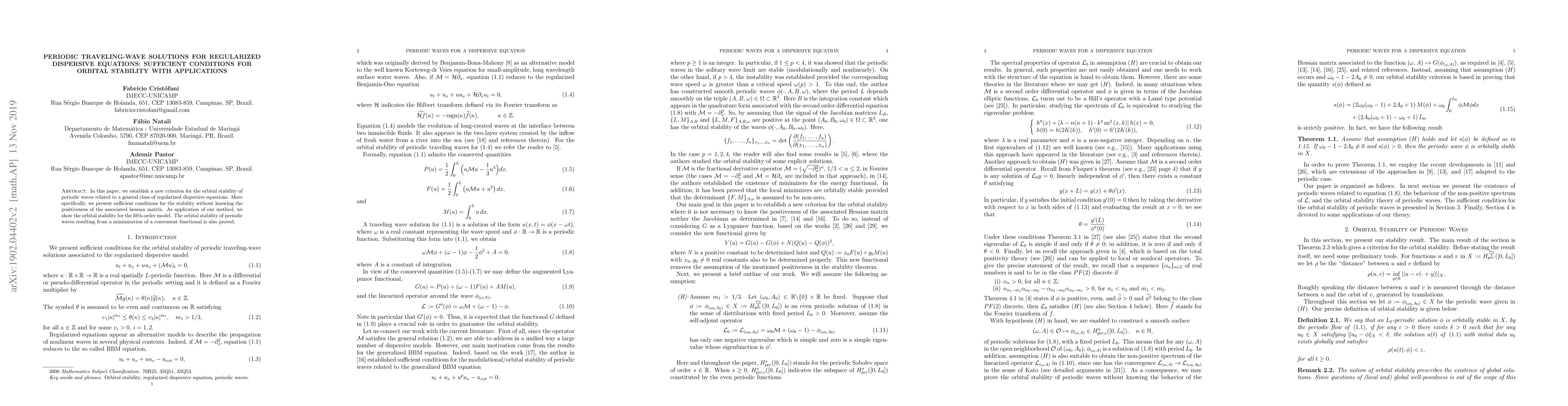 This paper introduces a new criterion for the orbital stability of periodic traveling waves in regularized dispersive equations, providing sufficient conditions for stability without requiring the positiveness of the Hessian matrix. An application to the fifth-order model demonstrates the effectiveness of the proposed method.