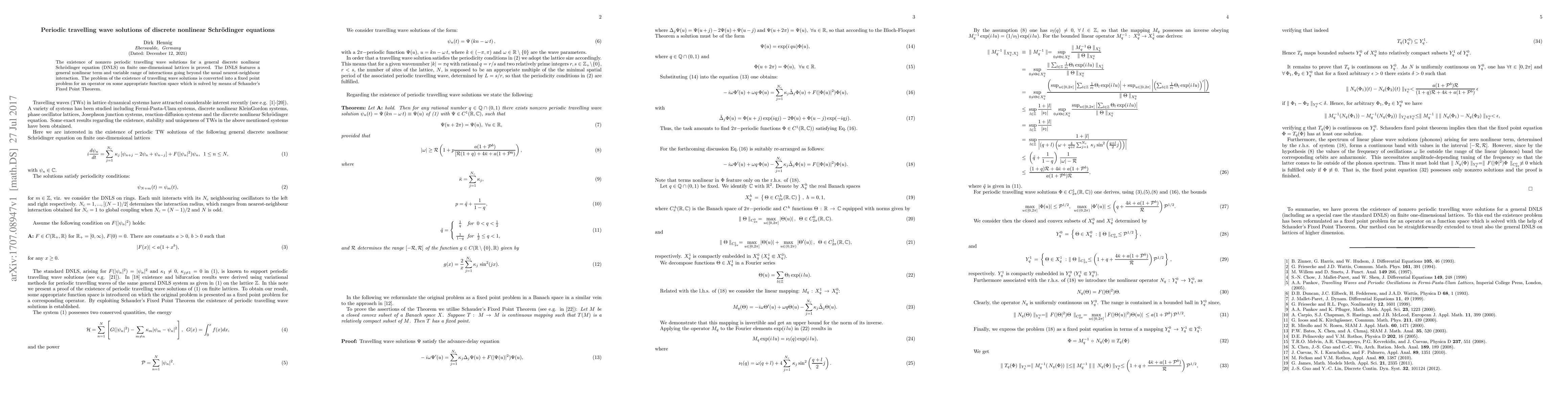 This paper proves the existence of nonzero periodic travelling wave solutions for a general discrete nonlinear Schrödinger equation on finite one-dimensional lattices, beyond typical nearest-neighbour interactions, using Schauder's Fixed Point Theorem to solve the associated fixed point problem.