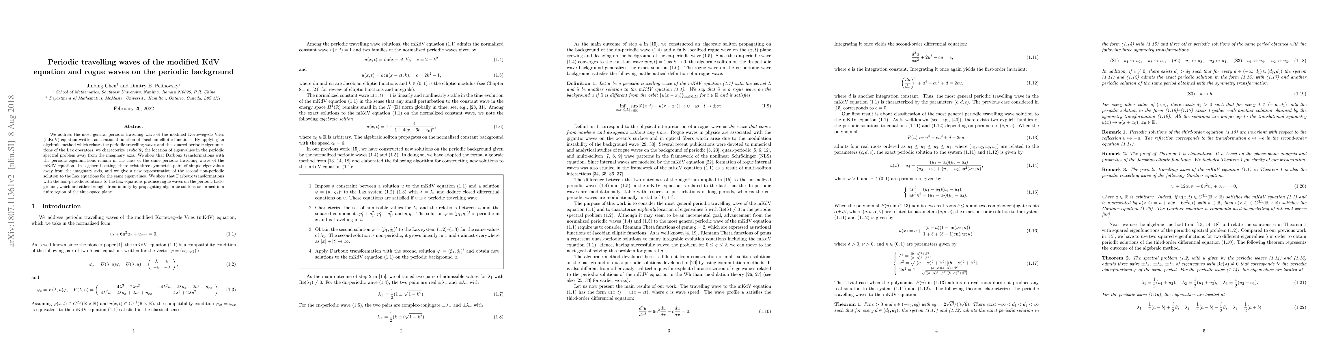 We address the most general periodic travelling wave of the modified Korteweg-de Vries (mKdV) equation written as a rational function of Jacobian elliptic functions. By applying an algebraic method which relates the periodic travelling waves and the squared periodic eigenfunctions of the Lax operators, we characterize explicitly the location of eigenvalues in the periodic spectral problem away from the imaginary axis. We show that Darboux transformations with the periodic eigenfunctions remain in the class of the same periodic travelling waves of the mKdV equation. In a general setting, there are exactly three symmetric pairs of eigenvalues away from the imaginary axis, and we give a new representation of the second non-periodic solution to the Lax equations for the same eigenvalues. We show that Darboux transformations with the non-periodic solutions to the Lax equations produce rogue waves on the periodic background, which are either brought from infinity by propagating algebraic solitons or formed in a finite region of the time-space plane.