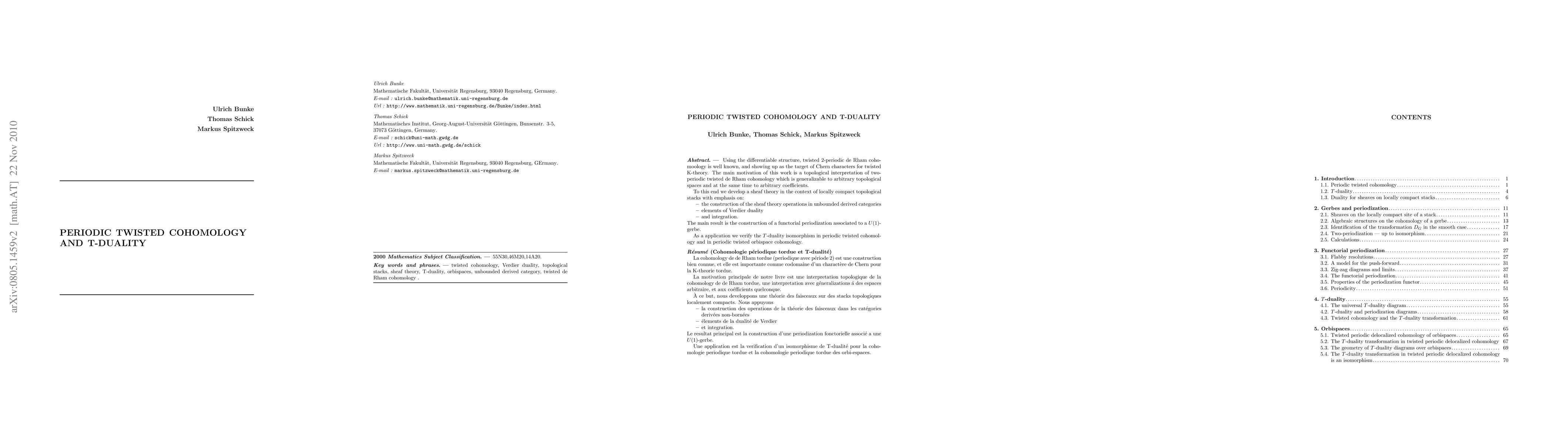 This paper develops a sheaf theory for two-periodic twisted de-Rham cohomology in topological stacks, constructing a periodization functor linked to U(1)-gerbes, and verifies $T$-duality isomorphisms in this framework.