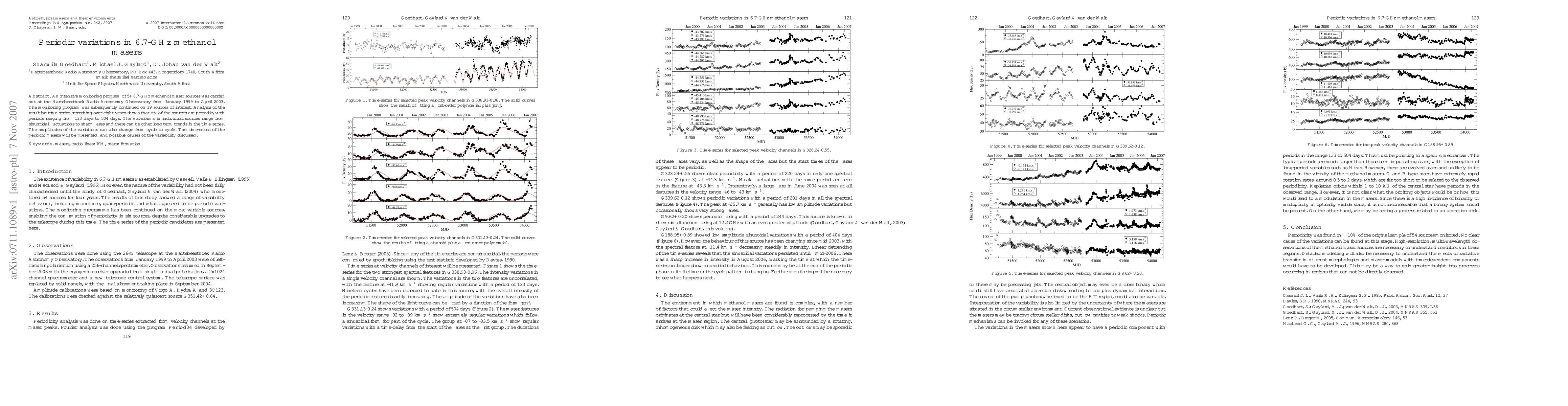 An intensive monitoring program of 54 6.7-GHz methanol maser sources was carried out at the Hartebeesthoek Radio Astronomy Observatory from January 1999 to April 2003. The monitoring program was subsequently continued on 19 sources of interest. Analysis of the resulting time-series stretching over eight years shows that six of the sources are periodic, with periods ranging from 133 days to 504 days. The waveforms in individual sources range from sinusoidal fluctuations to sharp flares and there can be other long term trends in the time-series. The amplitudes of the variations can also change from cycle to cycle. The time-series of the periodic masers will be presented, and possible causes of the variability discussed.