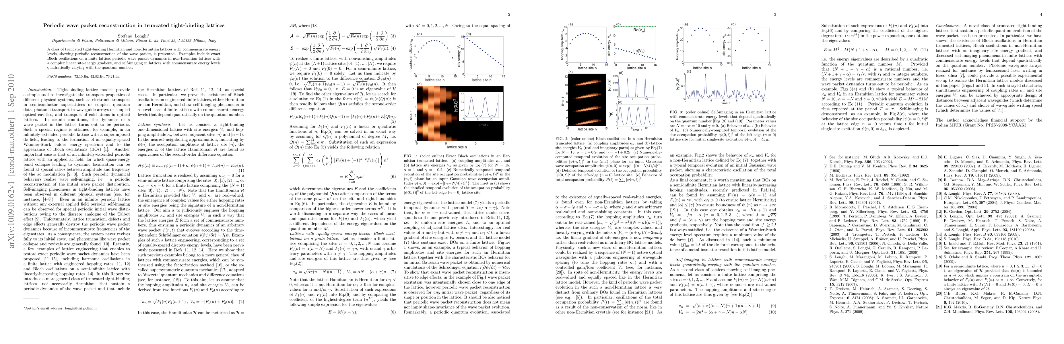 This paper investigates truncated tight-binding lattices that demonstrate periodic wave packet reconstruction, featuring exact Bloch oscillations, periodic dynamics in non-Hermitian systems, and self-imaging with quadratically-varying energy levels.