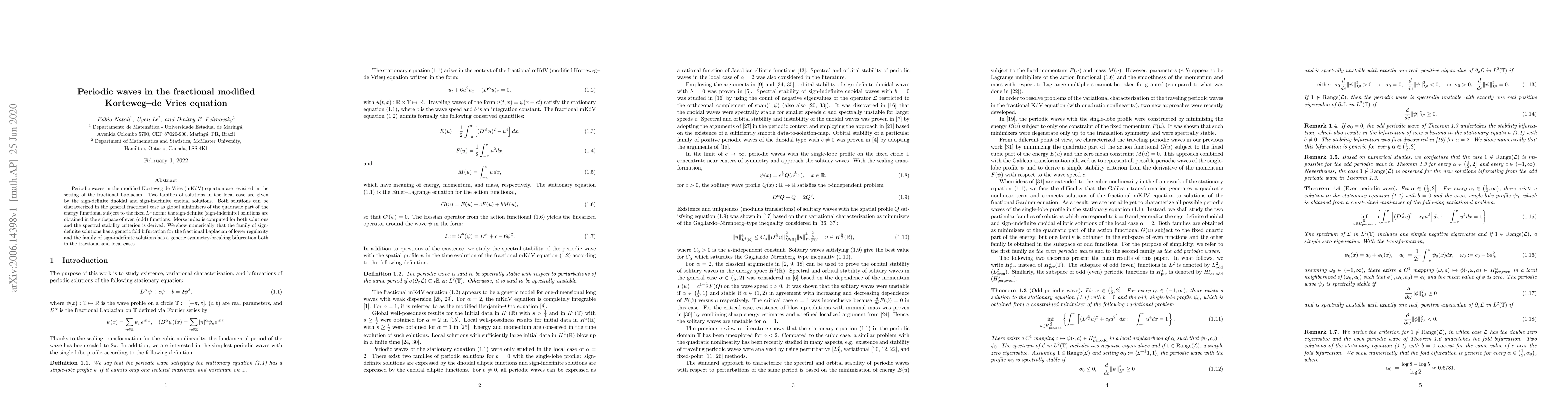This paper explores periodic wave solutions in the fractional modified Korteweg-de Vries equation, identifying two families of solutions characterized as global minimizers of the energy functional. It computes the Morse index and derives a spectral stability criterion, revealing bifurcation behaviors for both solution types.