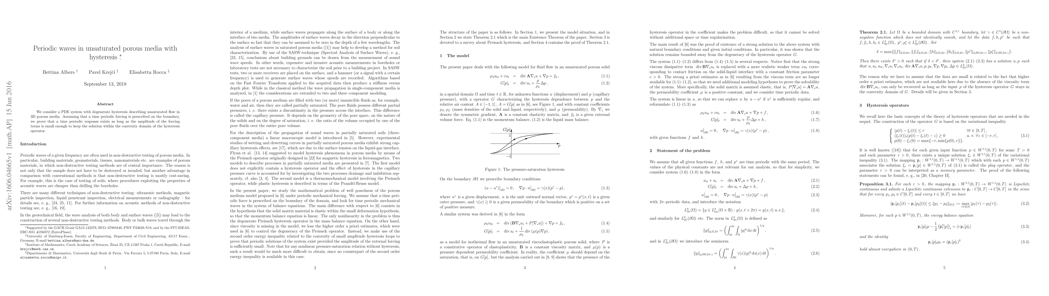 We consider a PDE system with degenerate hysteresis describing unsaturated flow in 3D porous media. Assuming that a time periodic forcing is prescribed on the boundary, we prove that a time periodic response exists as long as the amplitude of the forcing terms is small enough to keep the solution within the convexity domain of the hysteresis operator.