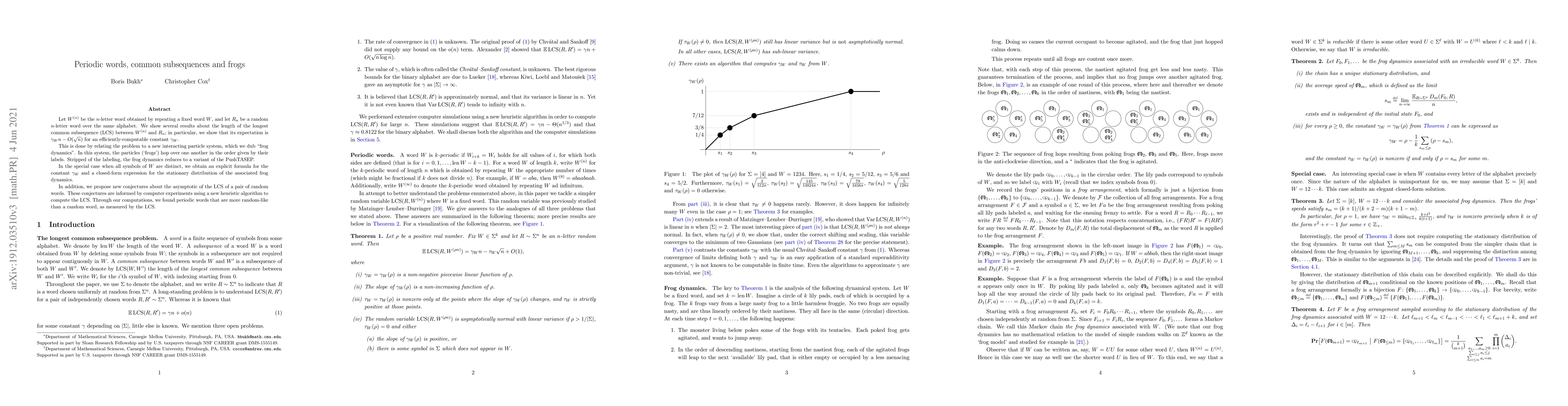 Let $W^{(n)}$ be the $n$-letter word obtained by repeating a fixed word $W$, and let $R_n$ be a random $n$-letter word over the same alphabet. We show several results about the length of the longest common subsequence (LCS) between $W^{(n)}$ and $R_n$; in particular, we show that its expectation is $\gamma_W n-O(\sqrt{n})$ for an efficiently-computable constant $\gamma_W$. This is done by relating the problem to a new interacting particle system, which we dub "frog dynamics". In this system, the particles (`frogs') hop over one another in the order given by their labels. Stripped of the labeling, the frog dynamics reduces to a variant of the PushTASEP. In the special case when all symbols of $W$ are distinct, we obtain an explicit formula for the constant $\gamma_W$ and a closed-form expression for the stationary distribution of the associated frog dynamics. In addition, we propose new conjectures about the asymptotic of the LCS of a pair of random words. These conjectures are informed by computer experiments using a new heuristic algorithm to compute the LCS. Through our computations, we found periodic words that are more random-like than a random word, as measured by the LCS.