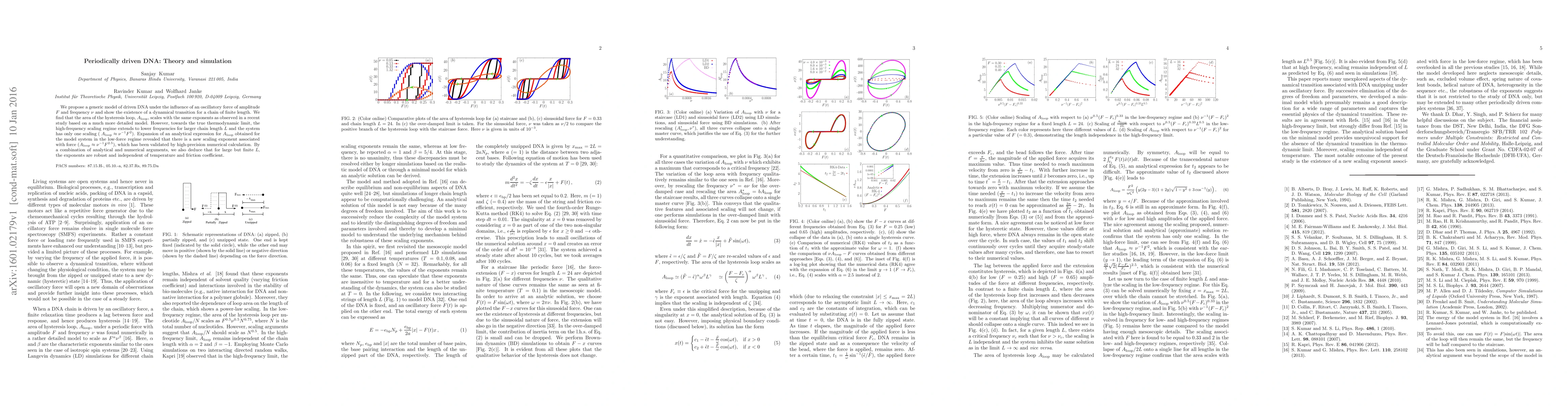 We propose a generic model of driven DNA under the influence of an oscillatory force of amplitude $F$ and frequency $\nu$ and show the existence of a dynamical transition for a chain of finite length. We find that the area of the hysteresis loop, $A_{\rm loop}$, scales with the same exponents as observed in a recent study based on a much more detailed model. However, towards the true thermodynamic limit, the high-frequency scaling regime extends to lower frequencies for larger chain length $L$ and the system has only one scaling ($A_{\rm loop} \approx \nu^{-1}F^2)$. Expansion of an analytical expression for $A_{\rm loop}$ obtained for the model system in the low-force regime revealed that there is a new scaling exponent associated with force ($A_{\rm loop} \approx \nu^{-1}F^{2.5}$), which has been validated by high-precision numerical calculation. By a combination of analytical and numerical arguments, we also deduce that for large but finite $L$, the exponents are robust and independent of temperature and friction coefficient.