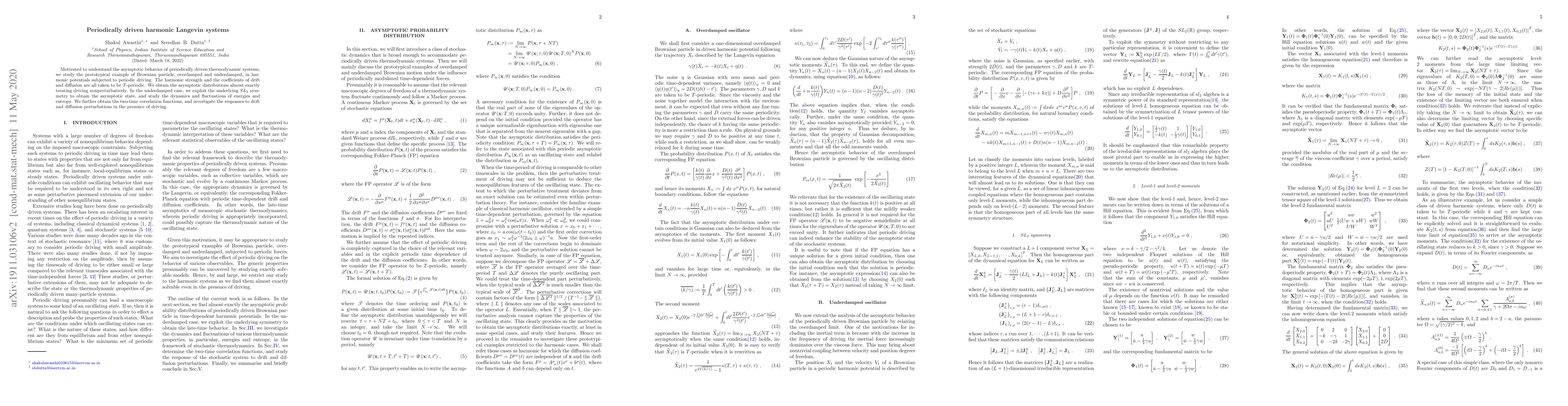 This paper investigates the asymptotic behavior of periodically driven Brownian particles in harmonic potentials, focusing on both overdamped and underdamped systems. It derives exact asymptotic distributions and explores the dynamics, fluctuations, and responses to perturbations, leveraging $SL_2$ symmetry in the underdamped case.