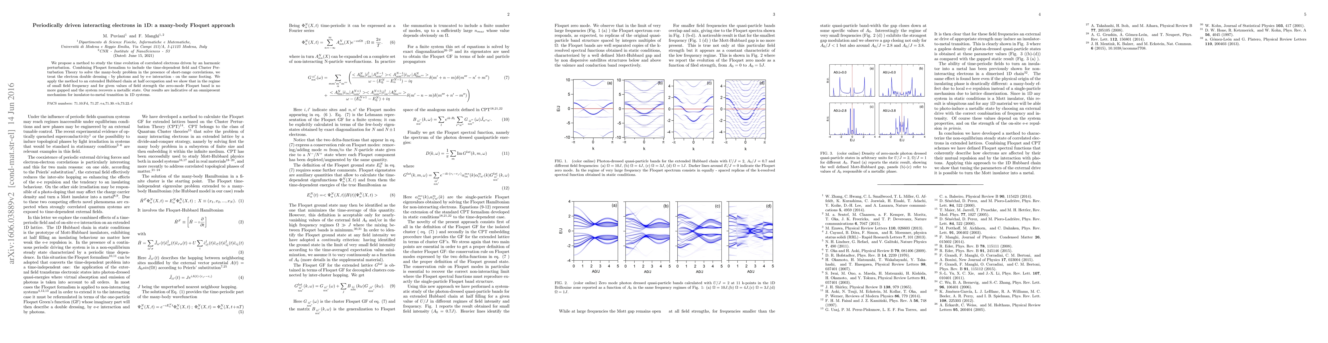We propose a method to study the time evolution of correlated electrons driven by an harmonic perturbation. Combining Floquet formalism to include the time-dependent field and Cluster Perturbation Theory to solve the many-body problem in the presence of short-range correlations, we treat the electron double dressing - by photons and by e-e interaction - on the same footing. We apply the method to an extended Hubbard chain at half occupation and we show that in the regime of small field frequency and for given values of field strength the zero-mode Floquet band is no more gapped and the system recovers a metallic state. Our results are indicative of an omnipresent mechanism for insulator-to-metal transition in 1D systems.