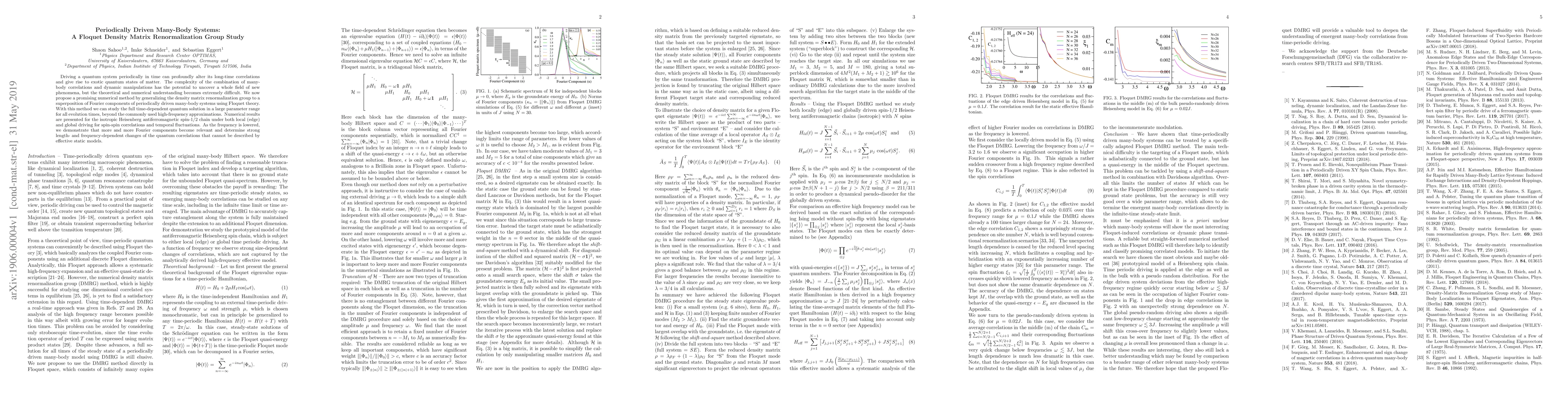 This paper proposes a novel numerical method based on the density matrix renormalization group and Floquet theory to analyze periodically driven many-body quantum systems, demonstrating its application to the Heisenberg antiferromagnetic spin-1/2 chain. The method reveals significant length- and frequency-dependent changes in quantum correlations that static models cannot capture.