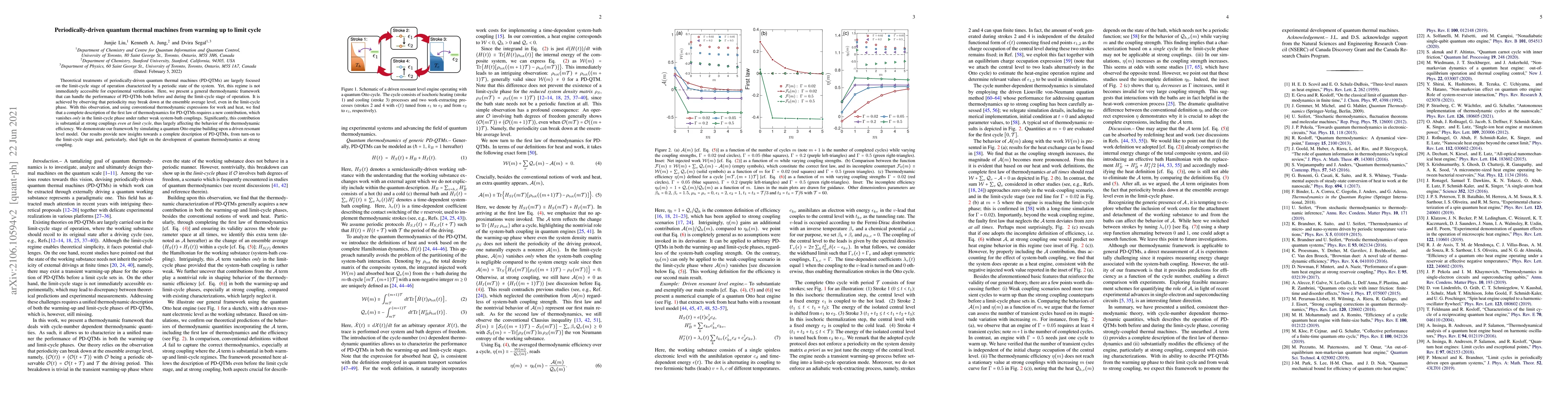 Theoretical treatments of periodically-driven quantum thermal machines (PD-QTMs) are largely focused on the limit-cycle stage of operation characterized by a periodic state of the system. Yet, this regime is not immediately accessible for experimental verification. Here, we present a general thermodynamic framework that can handle the performance of PD-QTMs both before and during the limit-cycle stage of operation. It is achieved by observing that periodicity may break down at the ensemble average level, even in the limit-cycle phase. With this observation, and using conventional thermodynamic expressions for work and heat, we find that a complete description of the first law of thermodynamics for PD-QTMs requires a new contribution, which vanishes only in the limit-cycle phase under rather weak system-bath couplings. Significantly, this contribution is substantial at strong couplings even at limit cycle, thus largely affecting the behavior of the thermodynamic efficiency. We demonstrate our framework by simulating a quantum Otto engine building upon a driven resonant level model. Our results provide new insights towards a complete description of PD-QTMs, from turn-on to the limit-cycle stage and, particularly, shed light on the development of quantum thermodynamics at strong coupling.