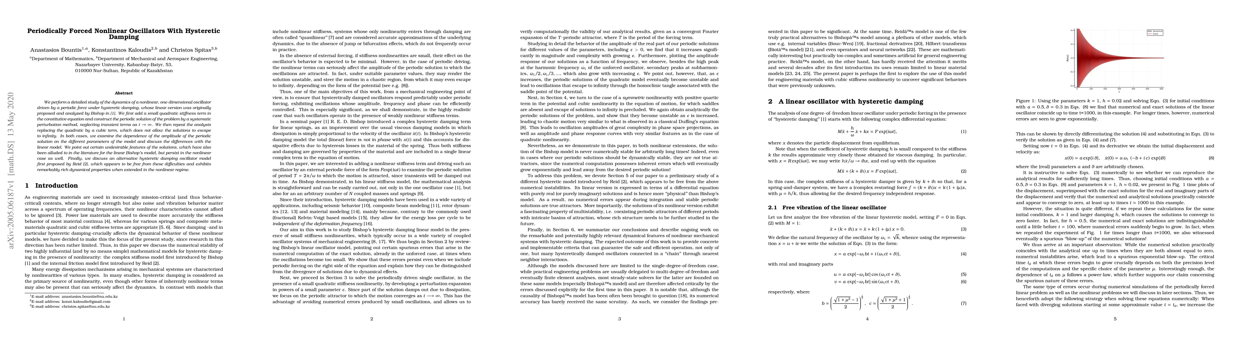 This paper studies the dynamics of a nonlinear oscillator under periodic forcing and hysteretic damping, comparing quadratic and cubic stiffness terms. It highlights persistent issues in the nonlinear model and proposes an alternative model by Reid that avoids these problems and shows rich dynamics.