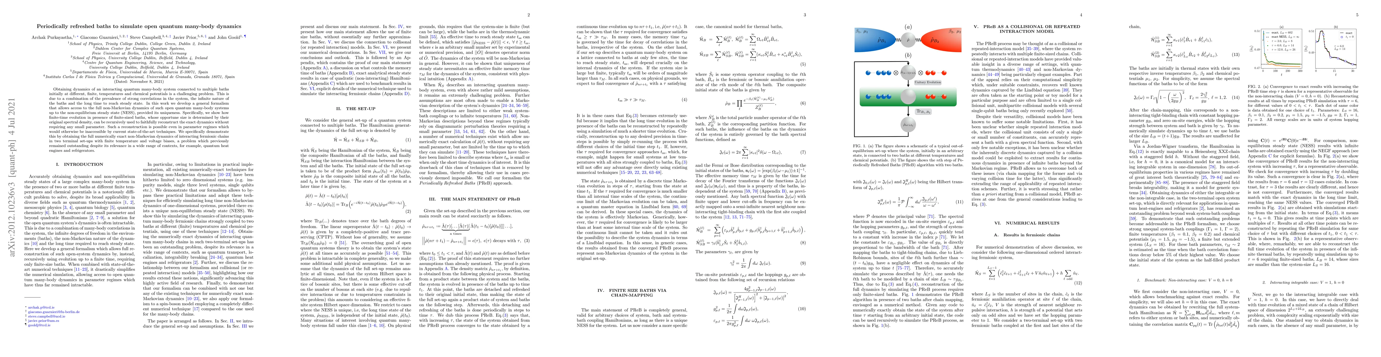 This paper develops a formalism to simulate the non-Markovian dynamics of open quantum many-body systems connected to multiple baths at different temperatures and chemical potentials. The method uses periodically refreshed finite-sized baths to reconstruct the exact dynamics, overcoming limitations of current state-of-the-art techniques.