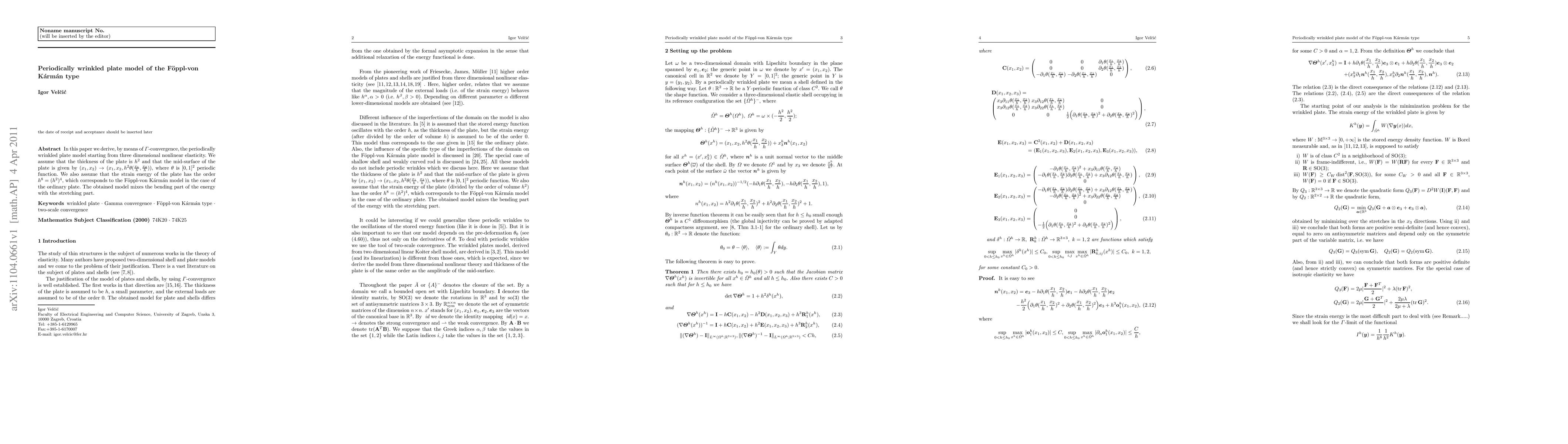 This paper derives a periodically wrinkled Föppl-von Kármán plate model from three-dimensional nonlinear elasticity using $\Gamma$-convergence. The model combines bending and stretching energies, assuming a plate thickness of $h^2$ and a mid-surface defined by a periodic function $\theta$.