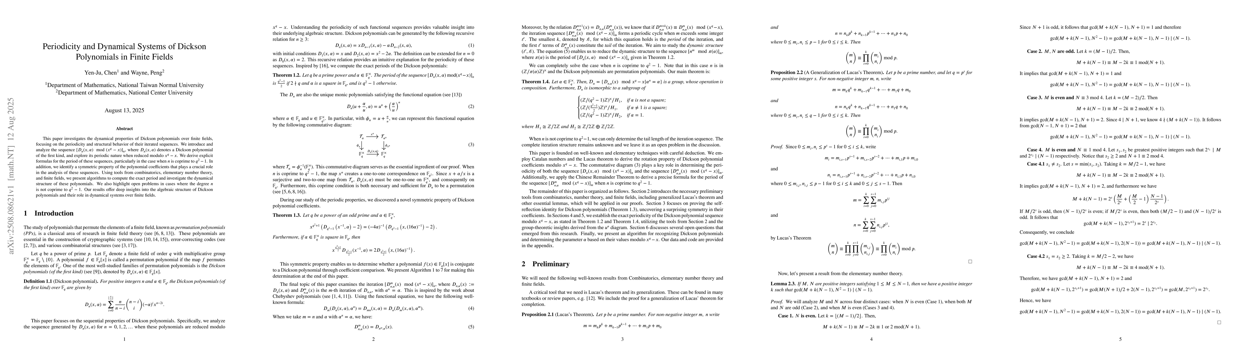 This paper investigates the dynamical properties of Dickson polynomials over finite fields, focusing on the periodicity and structural behavior of their iterated sequences. We introduce and analyze the sequence \( [D_n(x, \alpha) \mod (x^q - x)]_n \), where \( D_n(x, \alpha) \) denotes a Dickson polynomial of the first kind, and explore its periodic nature when reduced modulo \( x^q - x \). We derive explicit formulas for the period of these sequences, particularly in the case when \( n \) is coprime to \( q^2 - 1 \). In addition, we identify a symmetric property of the polynomial coefficients that plays a crucial role in the analysis of these sequences. Using tools from combinatorics, elementary number theory, and finite fields, we present algorithms to compute the exact period and investigate the dynamical structure of these polynomials. We also highlight open problems in cases where the degree \( n \) is not coprime to \( q^2 - 1 \). Our results offer deep insights into the algebraic structure of Dickson polynomials and their role in dynamical systems over finite fields.