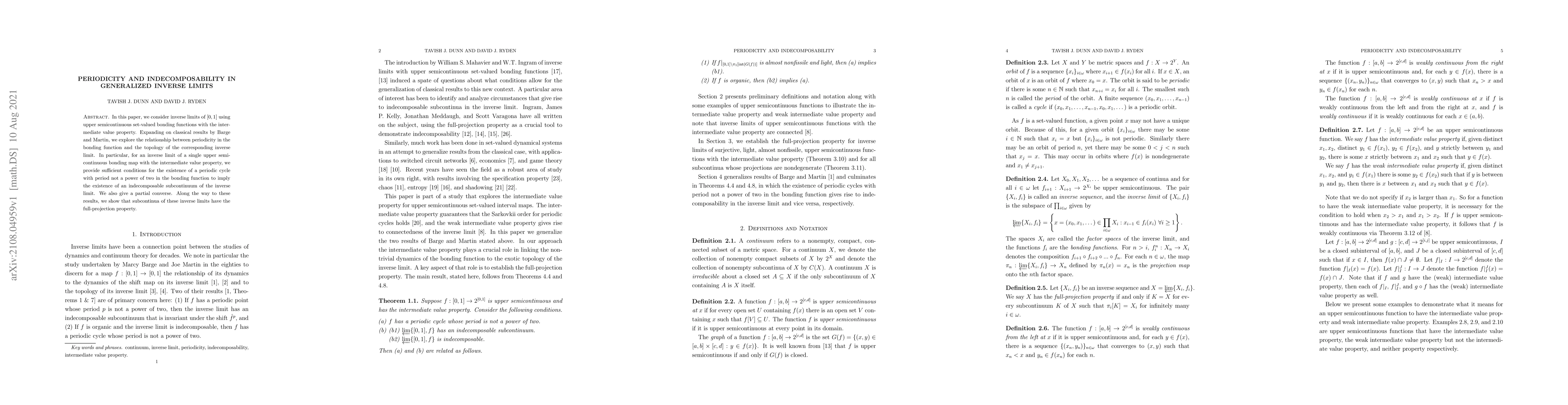 In this paper, we consider inverse limits of [0,1] using upper semicontinuous set-valued bonding functions with the intermediate value property. Expanding on classical results by Barge and Martin, we explore the relationship between periodicity in the bonding function and the topology of the corresponding inverse limit. In particular, for an inverse limit of a single upper semicontinuous bonding map with the intermediate value property, we provide sufficient conditions for the existence of a periodic cycle with period not a power of two in the bonding function to imply the existence of an indecomposable subcontinuum of the inverse limit. We also give a partial converse. Along the way to these results, we show that subcontinua of these inverse limits have the full-projection property.