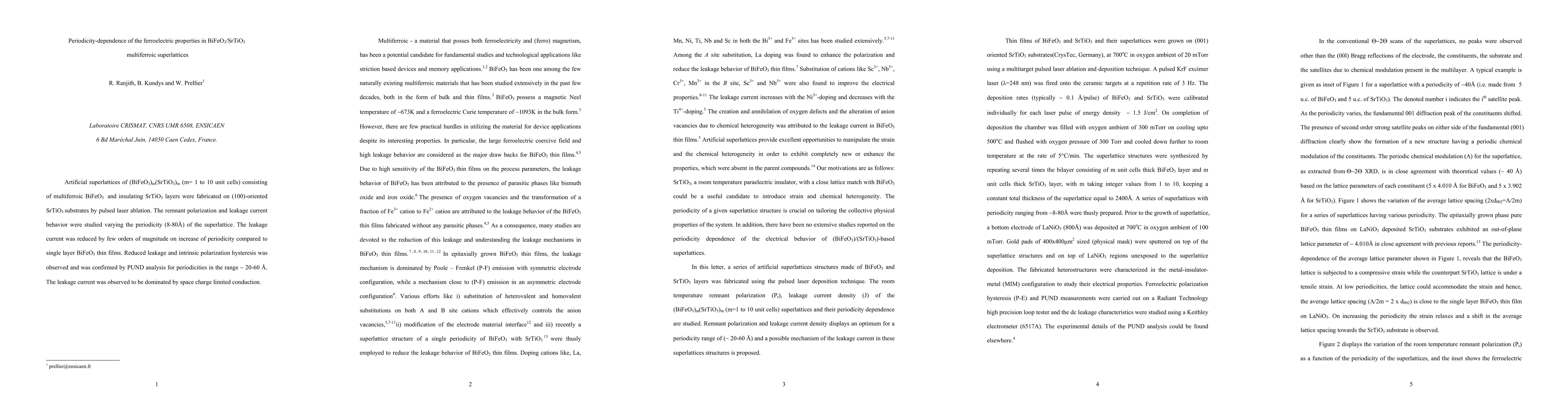 This study investigates the ferroelectric properties of BiFeO3/SrTiO3 superlattices with varying periodicities, finding reduced leakage current and enhanced polarization hysteresis in periodicities of 20-60Å, attributed to space charge limited conduction mechanisms.