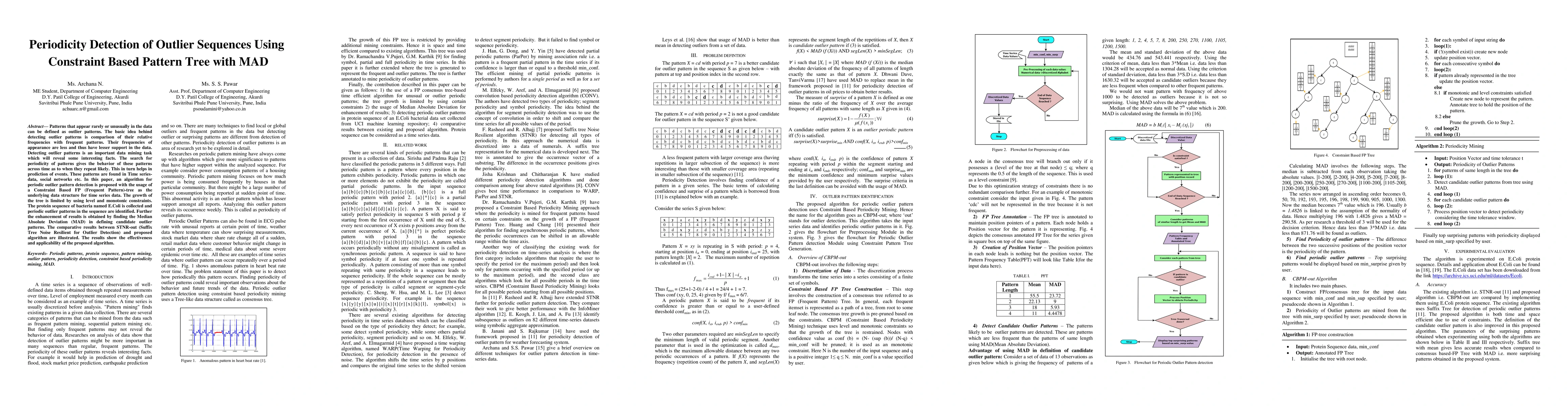 The paper proposes an algorithm, CBPM-out, for periodic outlier pattern detection using a Constraint Based FP Tree with Median Absolute Deviation (MAD). It involves preprocessing, consensus tree construction with constraints, annotation, candidate outlier pattern detection, periodicity identification, and displaying top surprising patterns.