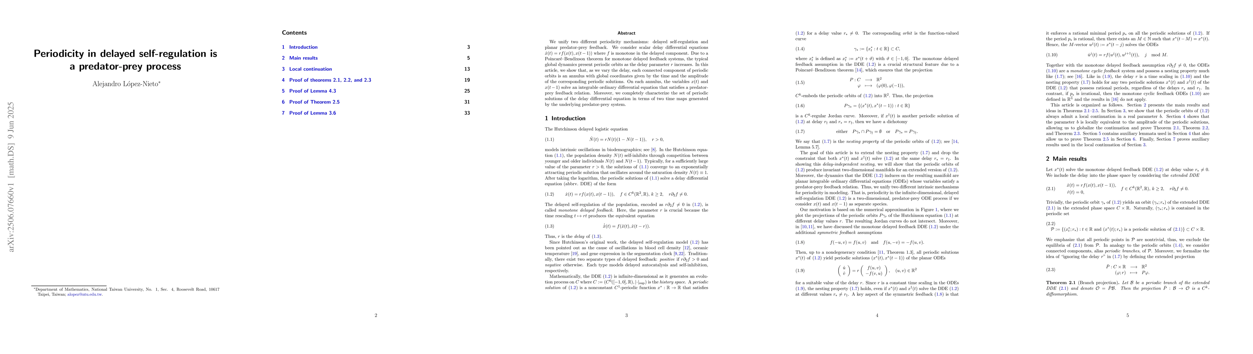We unify two different periodicity mechanisms: delayed self-regulation and planar predator-prey feedback. We consider scalar delay differential equations $\dot x(t) = rf(x(t), x(t - 1))$ where $f$ is monotone in the delayed component. Due to a Poincar\'{e}--Bendixson theorem for monotone delayed feedback systems, the typical global dynamics present periodic orbits as the delay parameter $r$ increases. In this article, we show that, as we vary the delay, each connected component of periodic orbits is an annulus with global coordinates given by the time and the amplitude of the corresponding periodic solutions. On each annulus, the variables $x(t)$ and $x(t - 1)$ solve an integrable ordinary differential equation that satisfies a predator-prey feedback relation. Moreover, we completely characterize the set of periodic solutions of the delay differential equation in terms of two time maps generated by the underlying predator-prey system.
