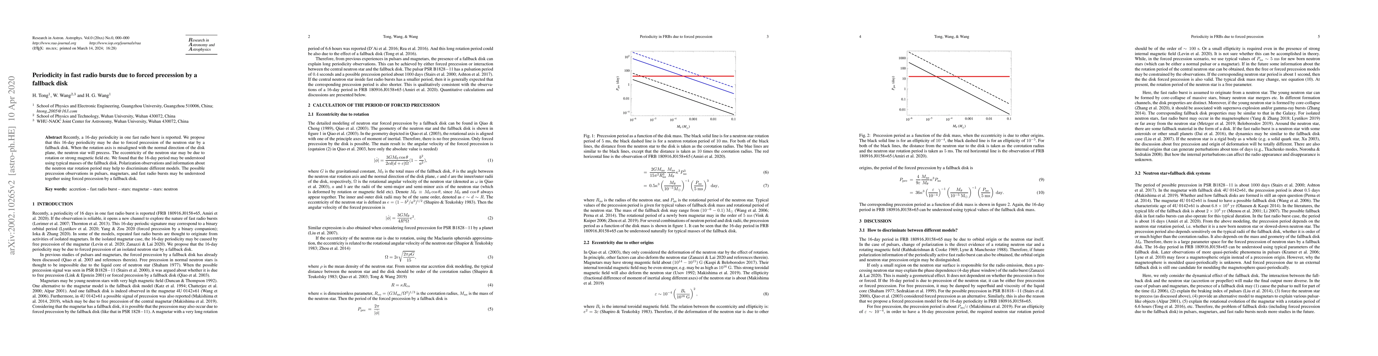 This paper proposes that a 16-day periodicity in a fast radio burst is due to the forced precession of a neutron star by a fallback disk, suggesting that misalignment of the rotation axis with the disk plane induces precession. Polarization and neutron star rotation data may help distinguish between models.