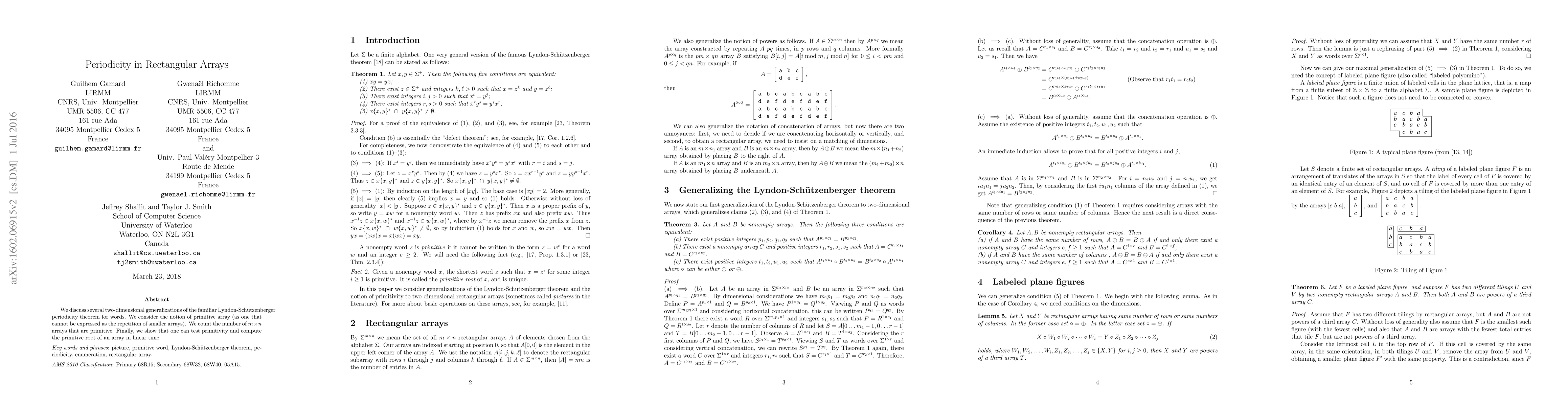 We discuss several two-dimensional generalizations of the familiar Lyndon-Schutzenberger periodicity theorem for words. We consider the notion of primitive array (as one that cannot be expressed as the repetition of smaller arrays). We count the number of m x n arrays that are primitive. Finally, we show that one can test primitivity and compute the primitive root of an array in linear time.
