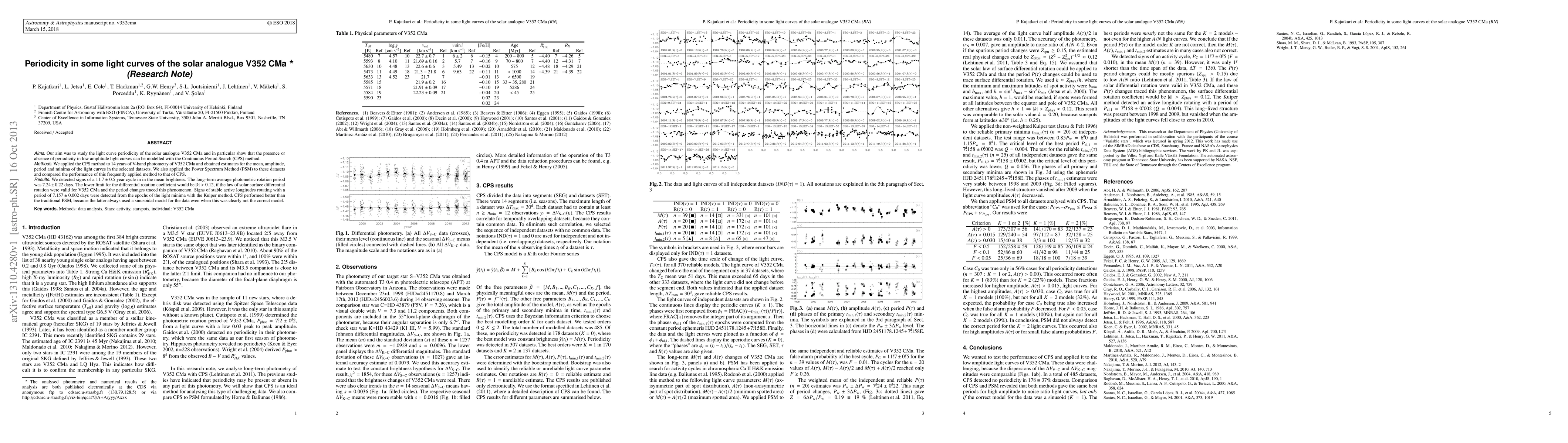 Our aim was to study the light curve periodicity of the solar analogue V352 CMa and in particular show that the presence or absence of periodicity in low amplitude light curves can be modelled with the Continuous Period Search (CPS) method. We applied the CPS method to 14 years of V-band photometry of V352 CMa and obtained estimates for the mean, amplitude, period and minima of the light curves in the selected datasets. We also applied the Power Spectrum Method (PSM) to these datasets and compared the performance of this frequently applied method to that of CPS. We detected signs of a $11.7 \pm 0.5$ year cycle in in the mean brightness. The long-term average photometric rotation period was $7.24 \pm 0.22$ days. The lower limit for the differential rotation coefficient would be $|k| > 0.12$, if the law of solar surface differential rotation were valid for V352 CMa and the period changes traced this phenomenon. Signs of stable active longitudes rotating with a period of $7.157 \pm 0.002$ days were detected from the epochs of the light minima with the Kuiper method. CPS performed better than the traditional PSM, because the latter always used a sinusoidal model for the data even when this was clearly not the correct model.